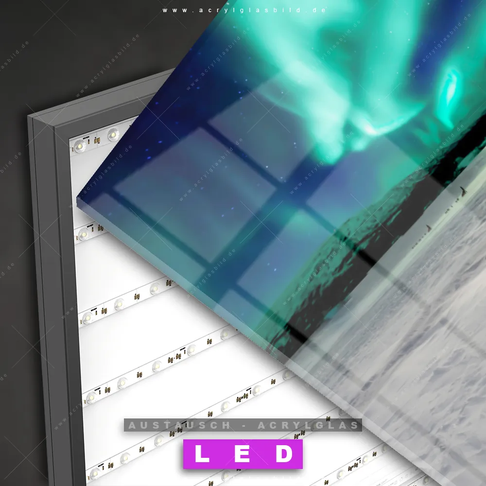 Begriffe wie Winter, Skandinavien, Nordlicht, Berg, Natur, Sonnenuntergang, Schnee, Norwegen, Lichter, Island, Hund haben dich auf der Suche nach deinem neuen Austausch-Acrylglasbild inspiriert? Dann sollte das Wechsel-Acrylglasbild Aurora Borealis und Schlittenhunde für dein bereits vorhandenes LED Acrylglasbild Canvalight® DIA den Weg zu dir finden.