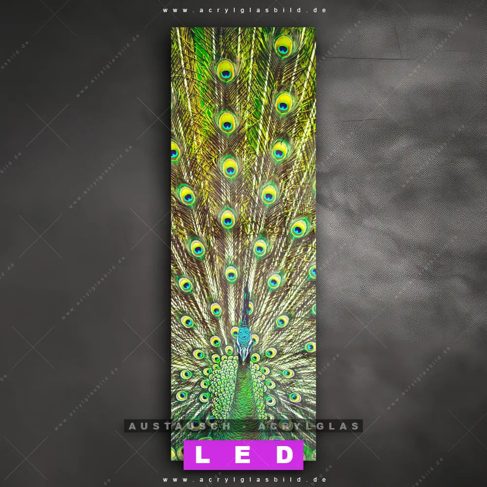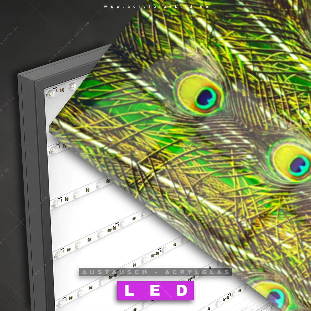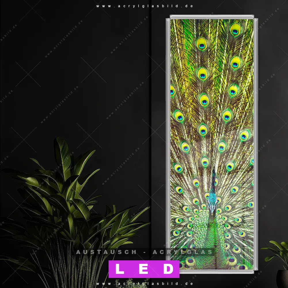 Begriffe wie Vogel, Pfau, Dschungel, Pfauenschwanz, Pfauenfedern haben dich auf der Suche nach deinem neuen Austausch-Acrylglasbild inspiriert? Dann sollte das Wechsel-Acrylglasbild Pfau für dein bereits vorhandenes LED Acrylglasbild Canvalight® DIA den Weg zu dir finden.