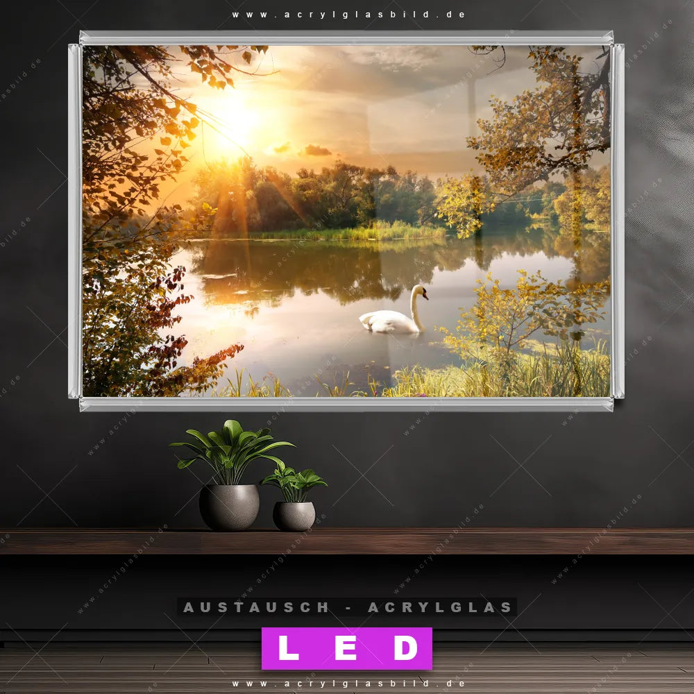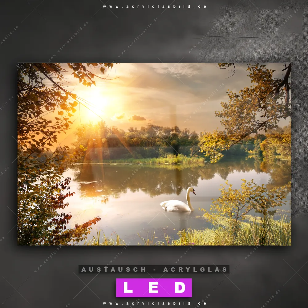 Begriffe wie Sonnenuntergang, Nebel, Morgenstimmung, See, Angeln, Teich, Herbst, Schwan haben dich auf der Suche nach deinem neuen Austausch-Acrylglasbild inspiriert? Dann sollte das Wechsel-Acrylglasbild Schwan bei Sonnenaufgang am See für dein bereits vorhandenes LED Acrylglasbild Canvalight® DIA den Weg zu dir finden.