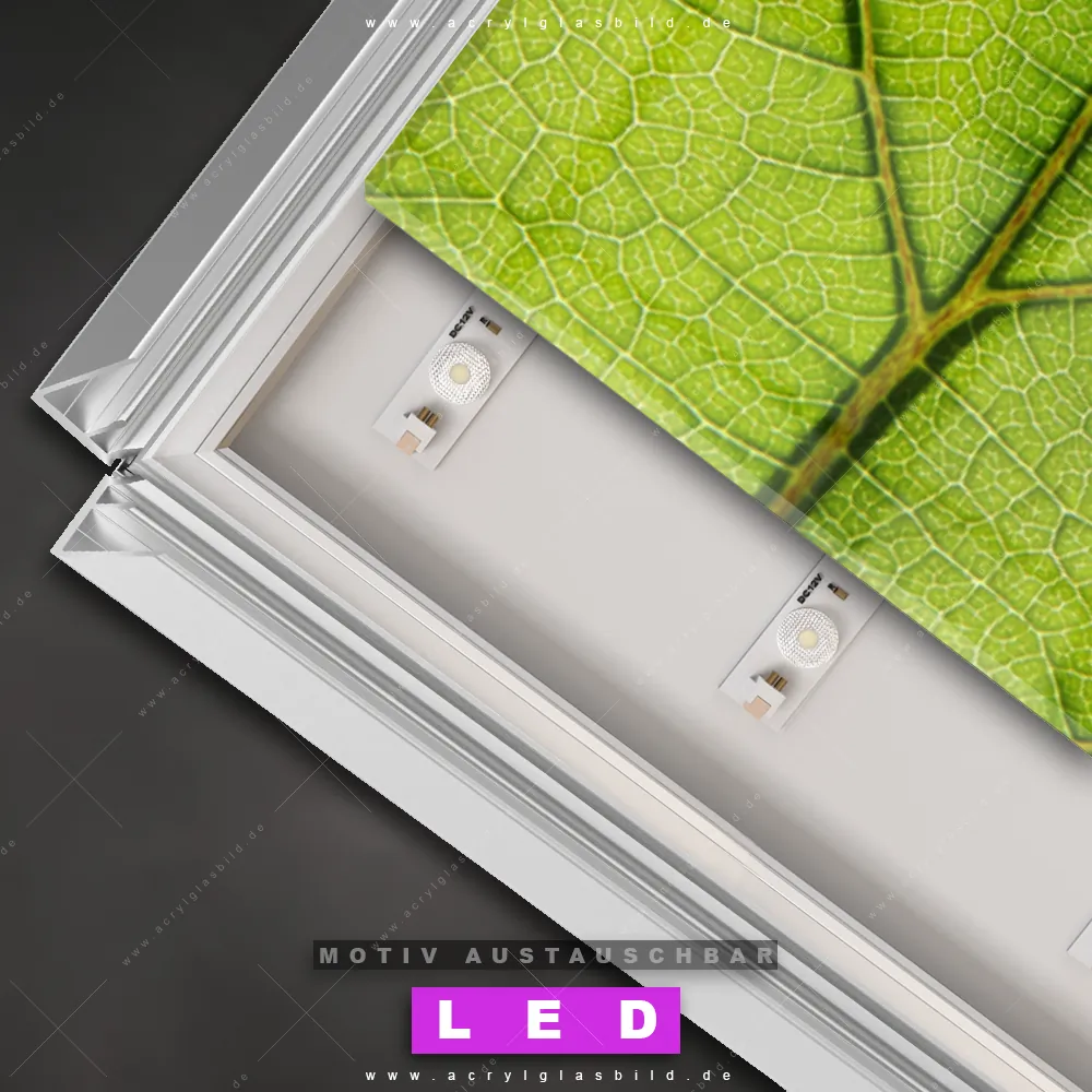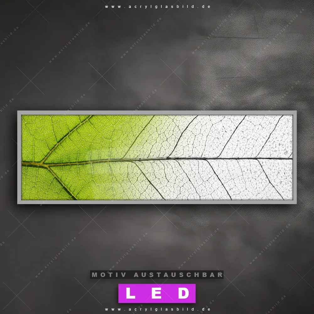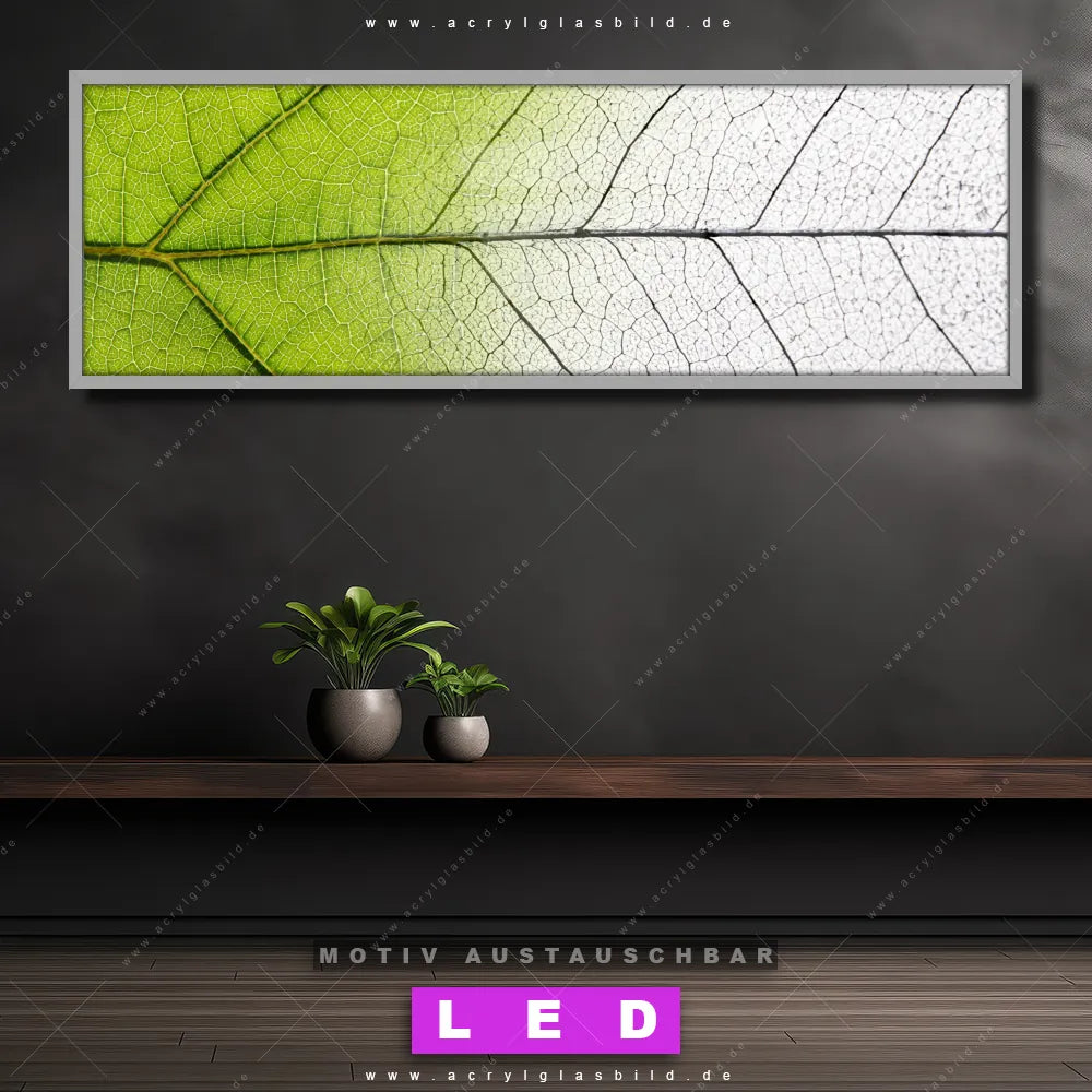 Wer will schon dunkle, triste Wände? Mit unserem LED Acrylglasbild Canvalight® DIA Laubblatt in weiß/grün und seiner fantastischen LED-Ausleuchtung werden deine Wände in Arzt - Praxis, Büro - Kanzlei, Wohnzimmer - Schlafzimmer zu echten Hinguckern. Wenn du auf der Suche nach einem beleuchteten Wandbild aus Acrylglas mit Blätter, Pflanze, Natur, Nahaufnahme, Vogelperspektive, Draufsicht, Blatt, Makro, Close Up, Blattadern bist, dann solltest du unser LED Leuchhtbild Nahaufnahme Laubblatt mit den beeindruckenden Motiv-Farben Weiss, Grün nicht verpassen. Gestaltet im angesagten Modern Art, Floral Stil, passt das LED Bild mit DIA-Klapprahmen und wechselbarer Acrylglas-Scheibe perfekt zu jedem Einrichtungsstil – selbst in deinem kleinen Dschungel aus Kreativität und Chaos!