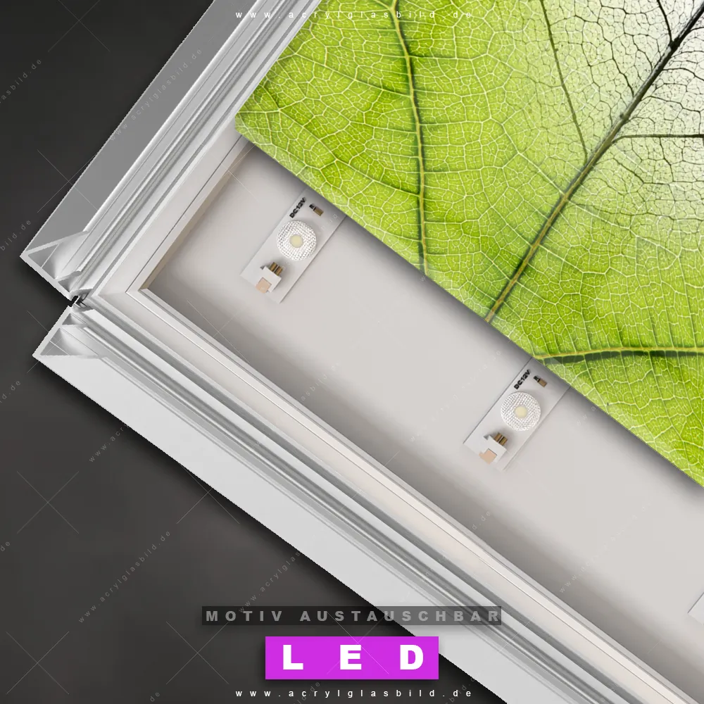 Also, worauf wartest du noch? Gib mit einem beleuchteten Wandbild mit wechselbarer Acrylglas-Scheibe deinen Wänden das gewisse Etwas und bestelle jetzt das LED Acrylglasbild Canvalight® DIA Blatt mit Strukturen – dein Zuhause wird es dir danken und deine Freunde werden dank der wechselbaren Motive erblassen!