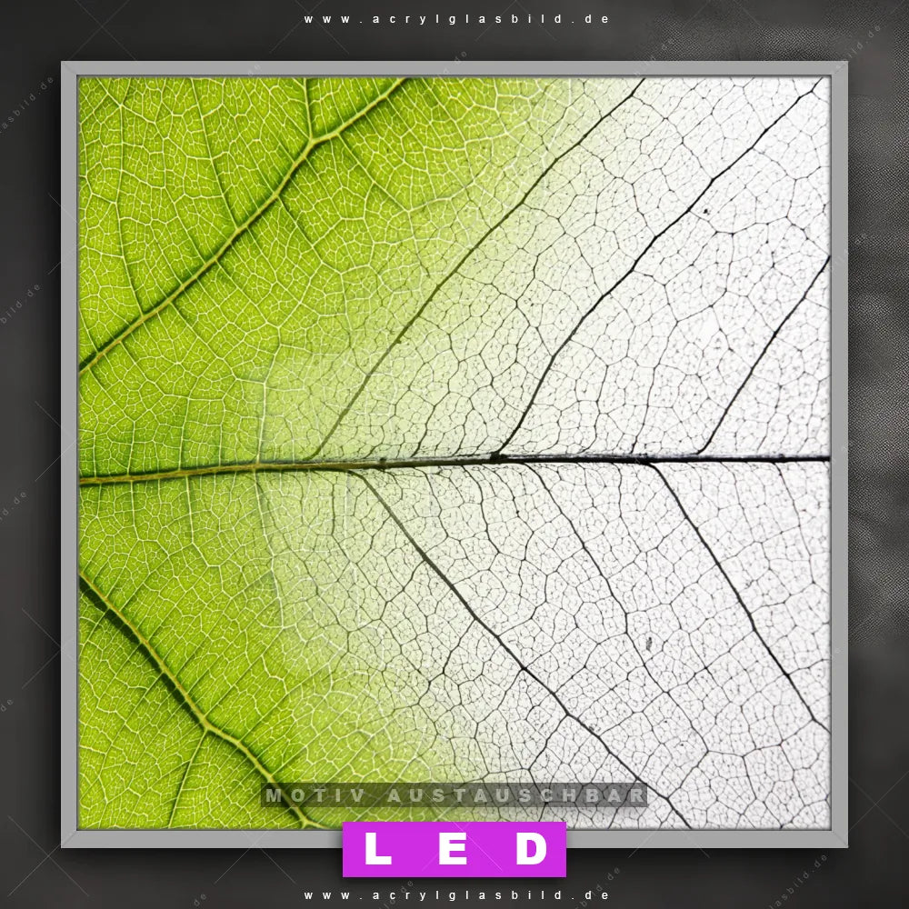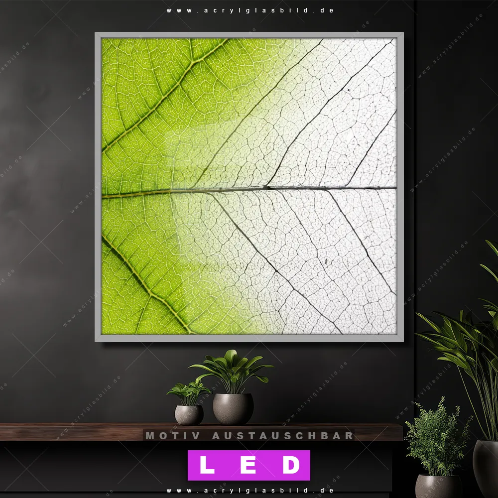 Bist du bereit, deine Wände mit einem dimmbaren LED Bild mit Fernbedienung und optionaler Farbtemperatursteuerung zum Leuchten zu bringen? Wir haben das ultimative Muster - Texturen, Blumen - Botanik LED Acrylglasbild Canvalight® DIA für dich! Unser LED Wandbild aus Acrylglas Grünes Blatt im Quadratischen Format mit austauschbarer bedruckter Acrylglas-Scheibe im DIA-Klapprahmen bringt sofort jede Menge Glanz in deine vier Wände.