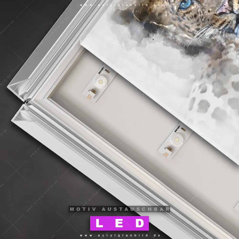 Also, worauf wartest du noch? Gib mit einem beleuchteten Wandbild mit wechselbarer Acrylglas-Scheibe deinen Wänden das gewisse Etwas und bestelle jetzt das LED Acrylglasbild Canvalight® DIA Verträumtes Porträt eines Leoparden – dein Zuhause wird es dir danken und deine Freunde werden dank der wechselbaren Motive erblassen!