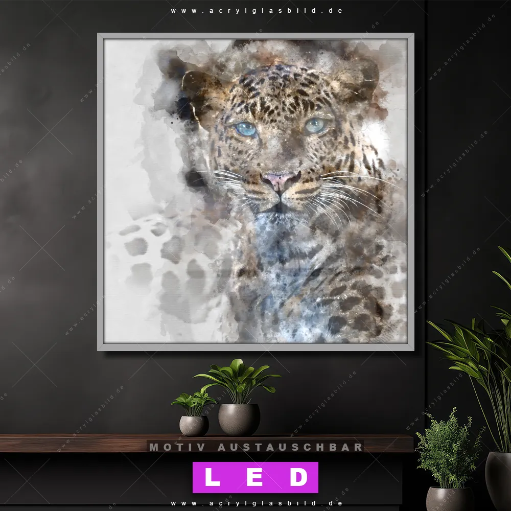Bist du bereit, deine Wände mit einem dimmbaren LED Bild mit Fernbedienung und optionaler Farbtemperatursteuerung zum Leuchten zu bringen? Wir haben das ultimative Tierwelt LED Acrylglasbild Canvalight® DIA für dich! Unser LED Wandbild aus Acrylglas Leopard Aquarell im Quadratischen Format mit austauschbarer bedruckter Acrylglas-Scheibe im DIA-Klapprahmen bringt sofort jede Menge Glanz in deine vier Wände.