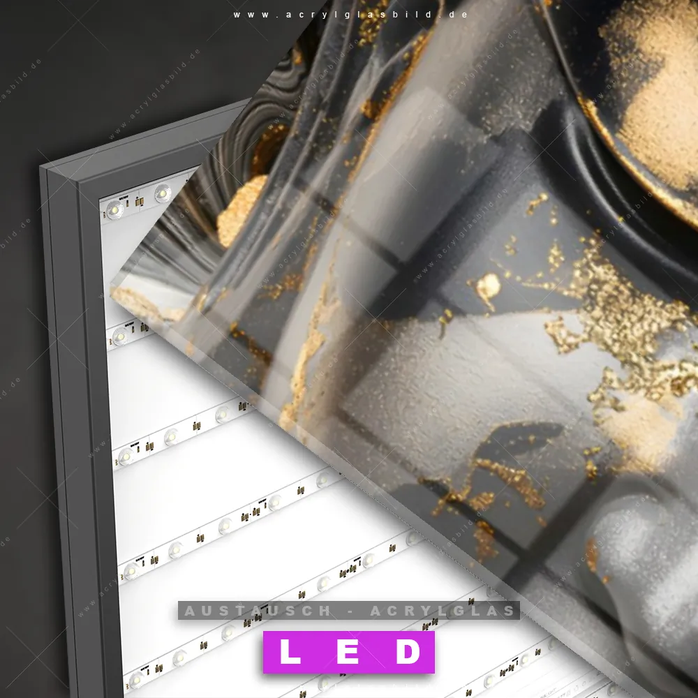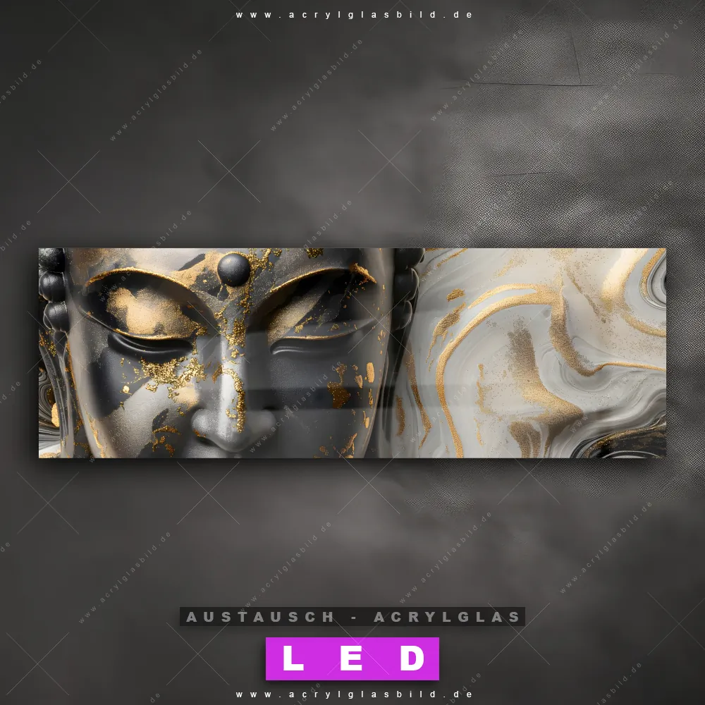 Begriffe wie Buddha, Fluid Art, Statue, Meditation, Buddhismus, Religion, Feng Shui, Zen haben dich auf der Suche nach deinem neuen Austausch-Acrylglasbild inspiriert? Dann sollte das Wechsel-Acrylglasbild Buddha-Statue mit Goldakzenten für dein bereits vorhandenes LED Acrylglasbild Canvalight® DIA den Weg zu dir finden.