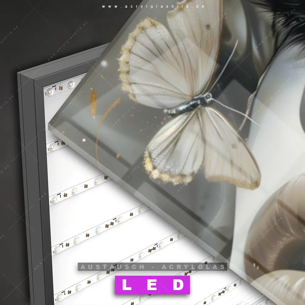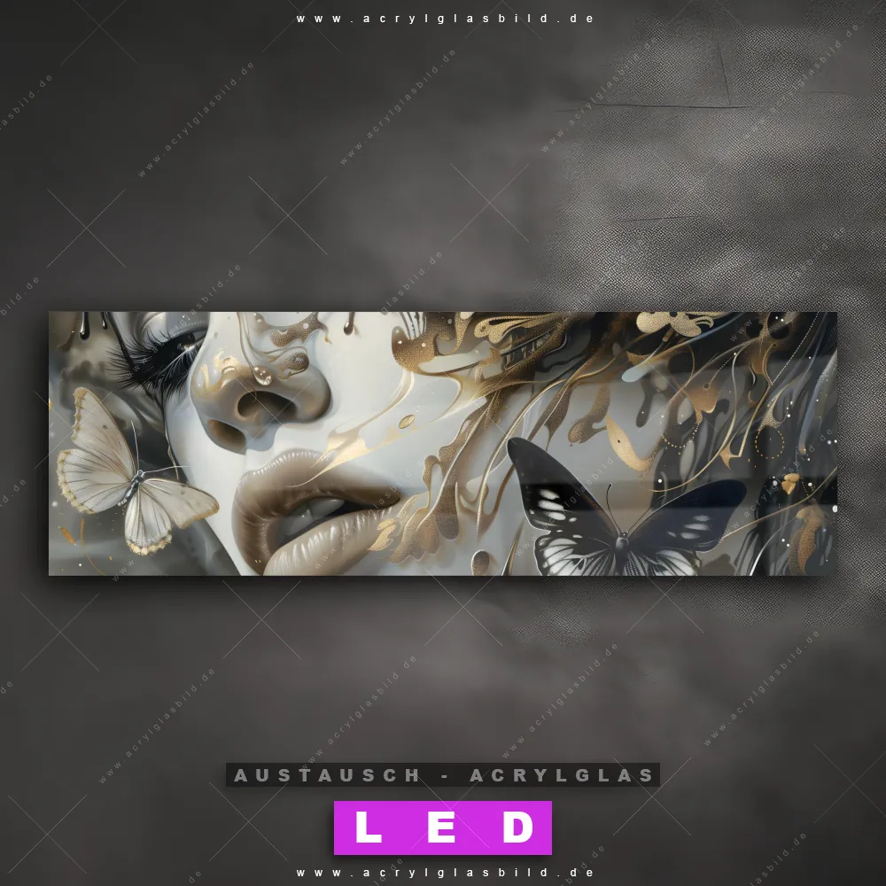 Begriffe wie Porträt, Gesicht, Frau, Schmetterlinge, Frauenporträt, Fluid Art, Farbspritzer haben dich auf der Suche nach deinem neuen Austausch-Acrylglasbild inspiriert? Dann sollte das Wechsel-Acrylglasbild Frauenporträt - Goldene Schmetterlingsvision für dein bereits vorhandenes LED Acrylglasbild Canvalight® DIA den Weg zu dir finden.