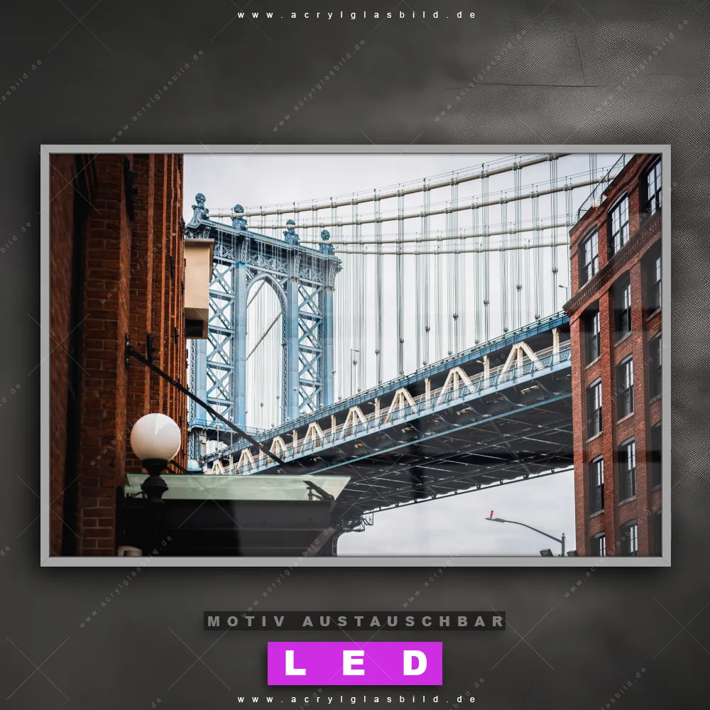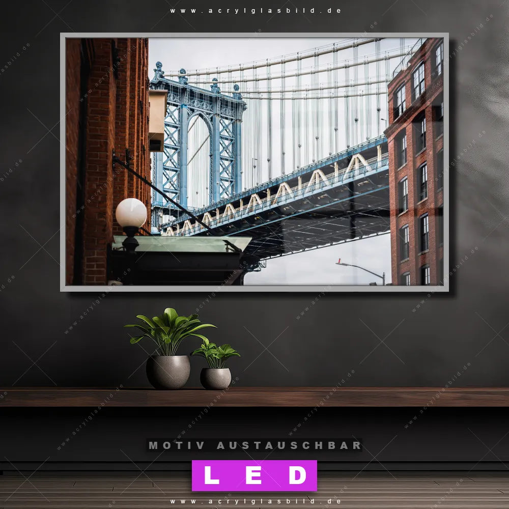 Mit unserem LED Acrylglasbild Canvalight® DIA Brücke in Manhatten und seiner genialen LED-Ausleuchtung wirst du nie wieder im Dunkeln auf deinem Sofa herumtappen. Wenn du nach einem beleuchteten Wandbild aus Acrylglas mit Brücke, New York City, Skyline, Manhatten, Amerika, New York, USA für Arzt - Praxis, Bar - Gastronomie, Büro - Kanzlei, Wohnzimmer - Schlafzimmer suchst, ist unser LED Leuchtbild Brücke in New York City in den beeindruckenden Motiv-Farben Braun, Beige, Blau, Hellblau, Ocker, Rot genau das richtige beleuchtete Wandbild für dich. Gestaltet im Natürlich - Realistisch, Modern Art Stil, passt dieses LED Wandbild mit DIA-Klapprahmen und glänzender Front aus Acrylglas perfekt zu jedem Einrichtungsstil – sogar zu deinem chaotischen kreativen Durcheinander!