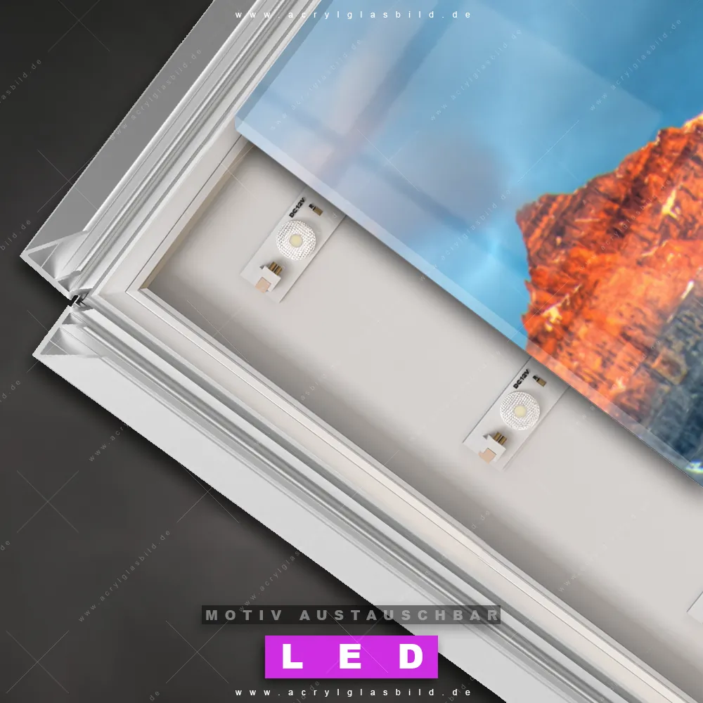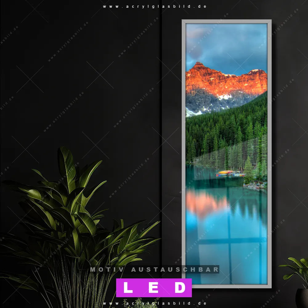 Bist du bereit, deine Wände mit einem dimmbaren LED Bild mit Fernbedienung und optionaler Farbtemperatursteuerung auf das nächste Level zu bringen? Unser Landschaften Canvalight® DIA LED Acrylglasbild ist genau das, was du brauchst! Das Wandbild mit LED Beleuchtung im Schmalen Format mit austauschbarer bedruckter Acrylglas-Scheibe Moränensee Sonnenaufgang bringt Licht und Stil in dein Zuhause – und das in null Komma nichts!