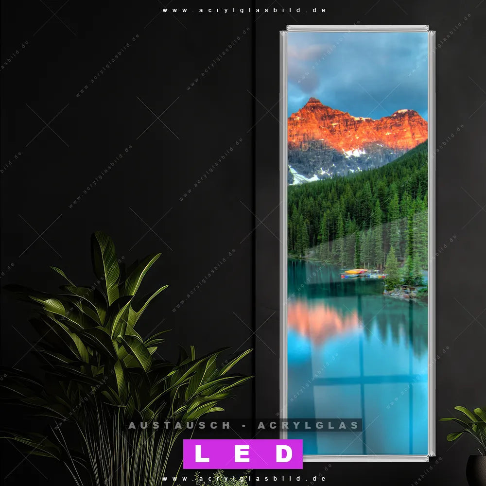Begriffe wie Natur, Berge, See, Himmel, Landschaft, Boote, Sonnenaufgang, Spiegelung, Abenteuer, wandern haben dich auf der Suche nach deinem neuen Austausch-Acrylglasbild inspiriert? Dann sollte das Wechsel-Acrylglasbild Glühende Berggipfel am stillen See für dein bereits vorhandenes LED Acrylglasbild Canvalight® DIA den Weg zu dir finden.