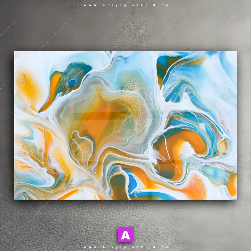 Das Motiv Fluid Art Lagune wird im UV-Direktdruck in den Farben Blau, Weiss, Beige, Ocker, Orange, Hellblau auf die Rückseite einer 5mm starken, transparenten Acrylglasplatte gedruckt. Das durchscheinende Motiv abstrakte Schneeoptik im Abstrakt, Modern Art Stil wird anschließend vollflächig mit einer weißen Schicht hinterlegt. Das Muster - Texturen Acrylglasbild | Querformat erhält so eine bemerkenswerte Farbbrillanz, hohe Schärfe und erstaunliche Tiefenwirkung.