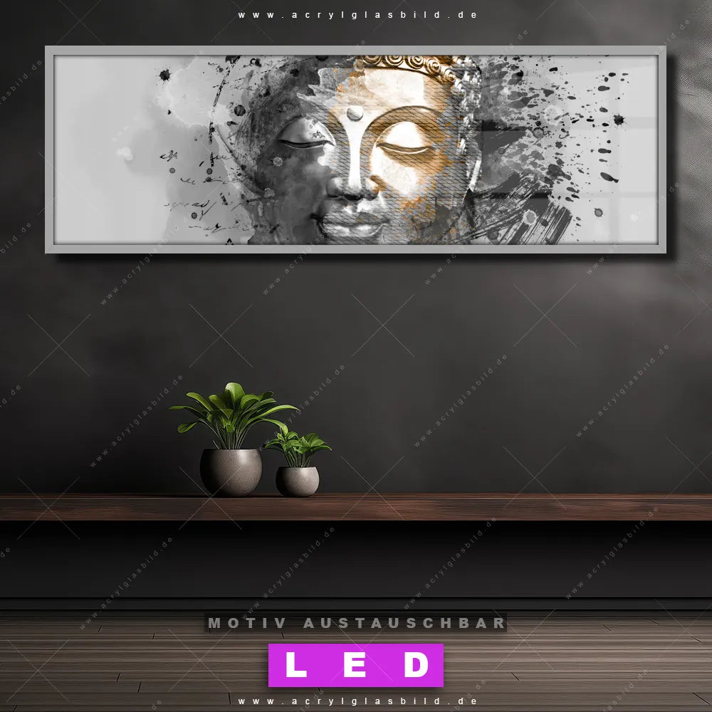 Wer will schon dunkle, triste Wände? Mit unserem LED Acrylglasbild Canvalight® DIA Buddha-Porträt in moderner Tintenkunst und seiner fantastischen LED-Ausleuchtung werden deine Wände in Arzt - Praxis, Wohnzimmer - Schlafzimmer, Bar - Gastronomie, Flur - Eingangsbereich zu echten Hinguckern. Wenn du auf der Suche nach einem beleuchteten Wandbild aus Acrylglas mit Feng Shui, Religion, Buddhismus, Buddha, Porträt, Grunge, Streetart, modern bist, dann solltest du unser LED Leuchhtbild Abstrakte Buddha-Skulptur in Grau- und Goldtönen mit den beeindruckenden Motiv-Farben Silber, Gold nicht verpassen. Gestaltet im angesagten Abstrakt, Grunge, Mixed Media, Modern Art Stil, passt das LED Bild mit DIA-Klapprahmen und wechselbarer Acrylglas-Scheibe perfekt zu jedem Einrichtungsstil – selbst in deinem kleinen Dschungel aus Kreativität und Chaos!