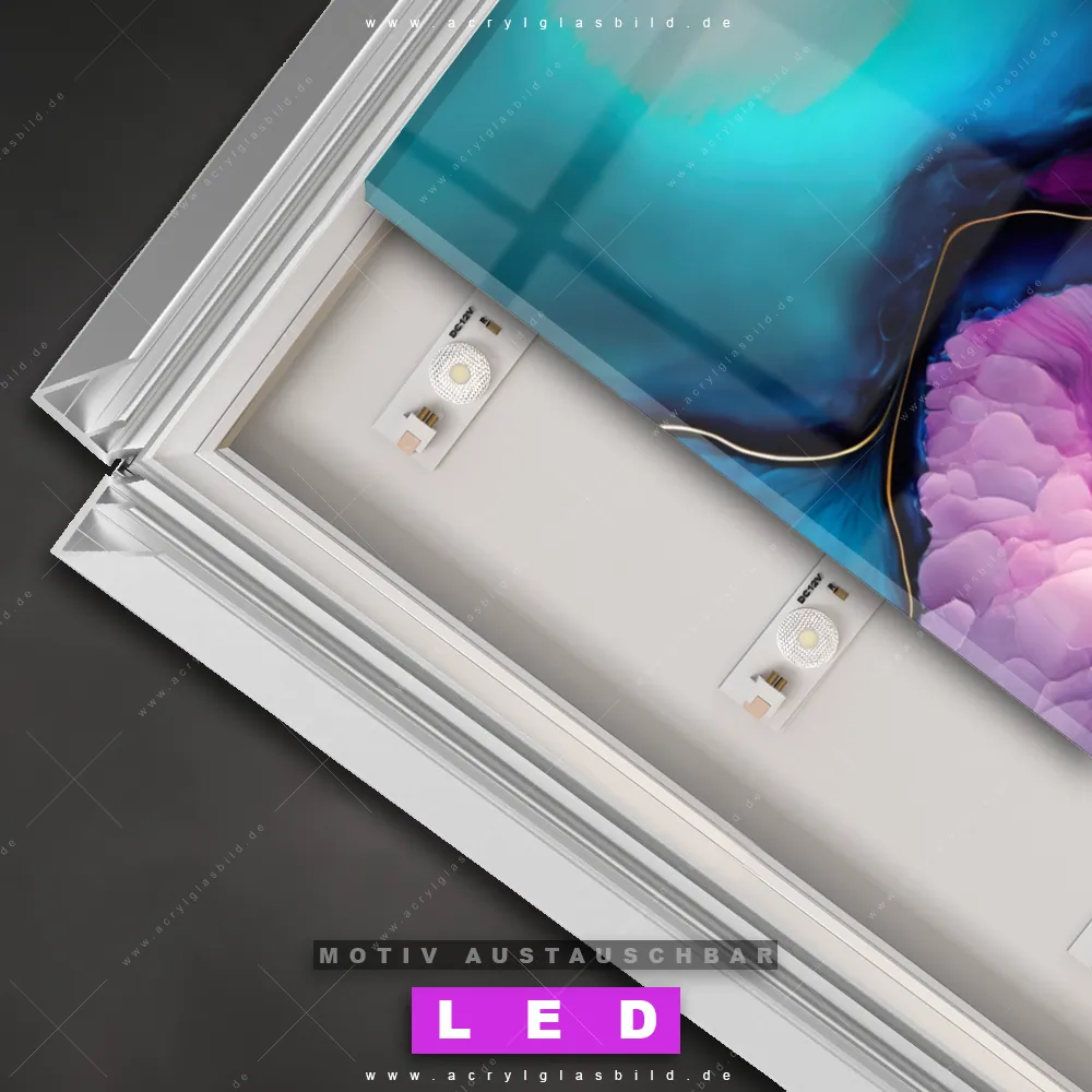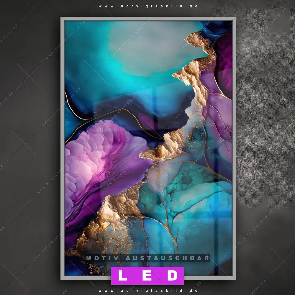 Wer braucht schon langweilige Wände, wenn man sie mit unserem LED Acrylglasbild Canvalight® DIA Fluid Art in lila, blau & gold aufpeppen kann? Dank der genialen LED-Ausleuchtung wirst du in Arzt - Praxis, Büro - Kanzlei, Wohnzimmer - Schlafzimmer, Bar - Gastronomie, Friseur - Beauty, Flur - Eingangsbereich nie wieder über deine eigenen Füße stolpern. Wenn du nach einem beleuchteten Wandbild aus Acrylglas mit Marmor, Flüssigkeit, Acryl, flüssig, Farbe, Marmorierung, Tinte, Fluid Art suchst, dann ist unser LED Acrylglasbild Goldener Lavendel in Marmoroptik in den hammermäßigen Motiv-Farben Lila, Blau, Gold, Türkis genau das richtige LED Bild für dich. Im coolen Abstrakt, Modern Art Stil gestaltet, passt das LED Leuchtbild mit DIA-Klapprahmen und glänzender Front aus Acrylglas perfekt zu jedem Einrichtungsstil – sogar zu deinem chaotischen Kreativlabor!
