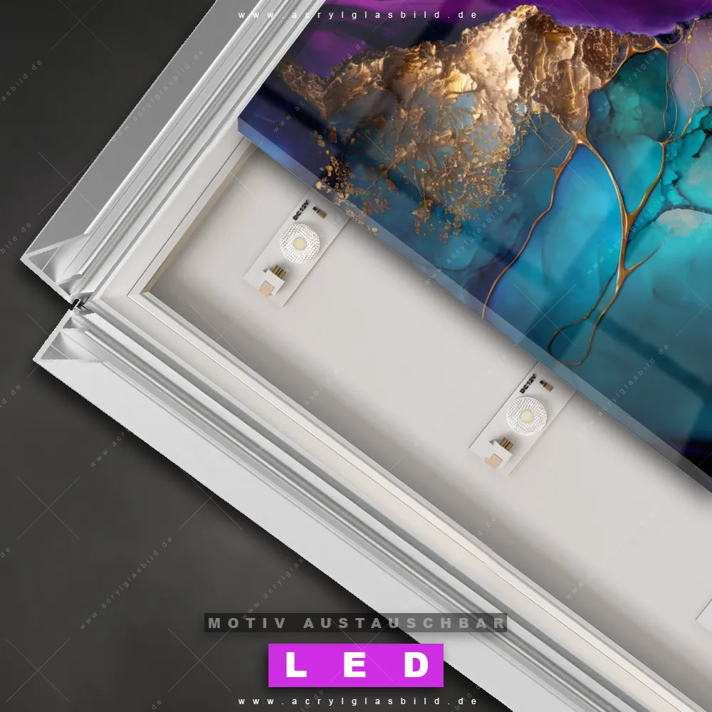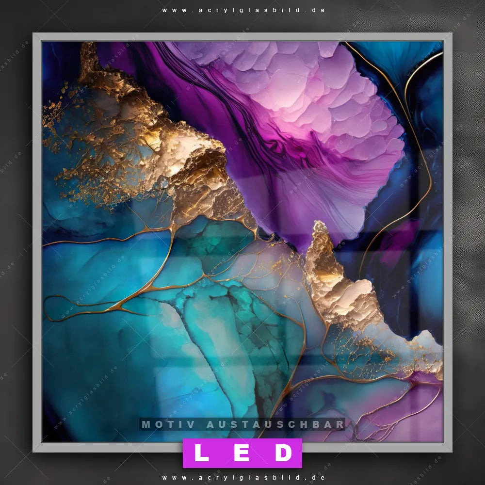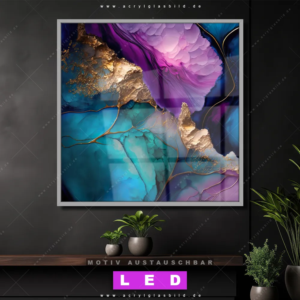 Vergiss dunkle Ecken und Langeweile! Mit unserem Acrylglasbild Fluid Art in lila, blau & gold und seiner brillanten LED-Ausleuchtung wirst du dich nie wieder in der Dunkelheit verirren. Wenn du auf der Suche nach einem beleuchteten Wandbild aus Acrylglas mit Marmor, Flüssigkeit, Acryl, flüssig, Farbe, Marmorierung, Tinte, Fluid Art bist, ist unser LED Acrylglasbild Canvalight® DIA Goldener Lavendel in Marmoroptik mit den strahlenden Motiv-Farben Lila, Blau, Gold, Türkis genau das richtige Leuchtbild für dich. Das im Abstrakt, Modern Art Stil gestaltete LED Bild mit glänzender Front aus Acrylglas passt perfekt zu jedem Einrichtungsstil in Arzt - Praxis, Büro - Kanzlei, Wohnzimmer - Schlafzimmer, Bar - Gastronomie, Friseur - Beauty, Flur - Eingangsbereich – vom minimalistischen Chic bis zum kreativen Chaos.