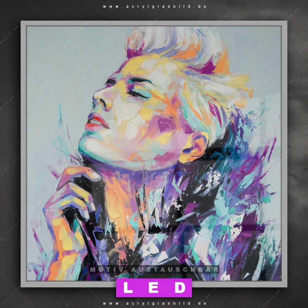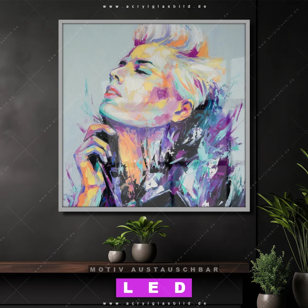 Vergiss dunkle Ecken und Langeweile! Mit unserem Acrylglasbild farbenfrohe Schönheit und seiner brillanten LED-Ausleuchtung wirst du dich nie wieder in der Dunkelheit verirren. Wenn du auf der Suche nach einem beleuchteten Wandbild aus Acrylglas mit Abstrakt, Modern, Kunst, Gemälde, Ölfarbe, Leinwand, Frau, Portrait, Gesicht bist, ist unser LED Acrylglasbild Canvalight® DIA buntes Porträt einer Frau mit den strahlenden Motiv-Farben Türkis, Lila, Hellblau, Weiss genau das richtige Leuchtbild für dich. Das im Abstrakt, Modern Art Stil gestaltete LED Bild mit glänzender Front aus Acrylglas passt perfekt zu jedem Einrichtungsstil in Wohnzimmer - Schlafzimmer, Bar - Gastronomie, Friseur - Beauty – vom minimalistischen Chic bis zum kreativen Chaos.