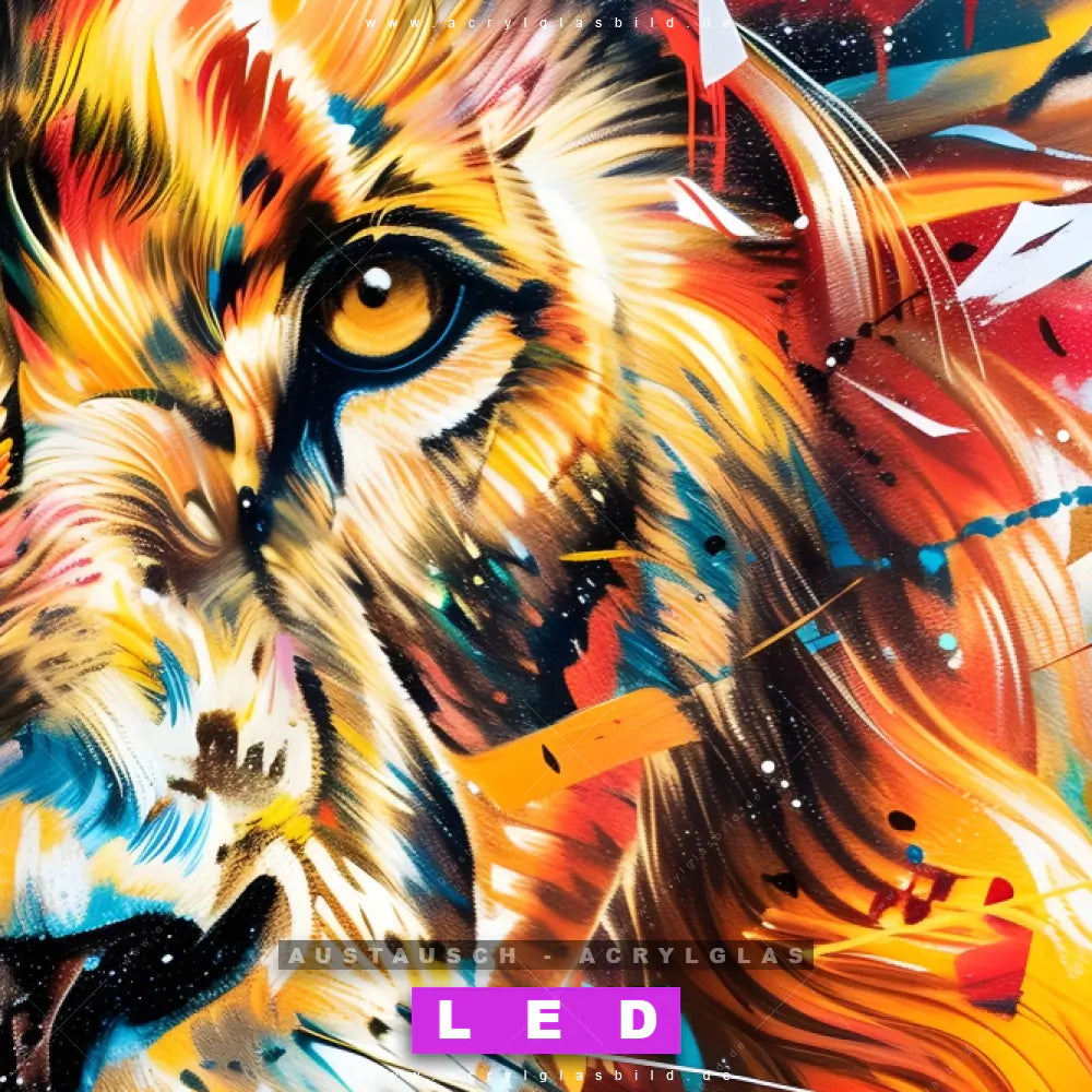 Begriffe wie Raubkatze, Löwe, Afrika, Dschungel, Lion, Graffiti, Raubtier, Löwenkopf, Wildtier, Farbexplosion, Farbspritzer, Farbe, Tierporträt haben dich auf der Suche nach deinem neuen Austausch-Acrylglasbild inspiriert? Dann sollte das Wechsel-Acrylglasbild Löwe Graffiti Kunst für dein bereits vorhandenes LED Acrylglasbild Canvalight® DIA den Weg zu dir finden.