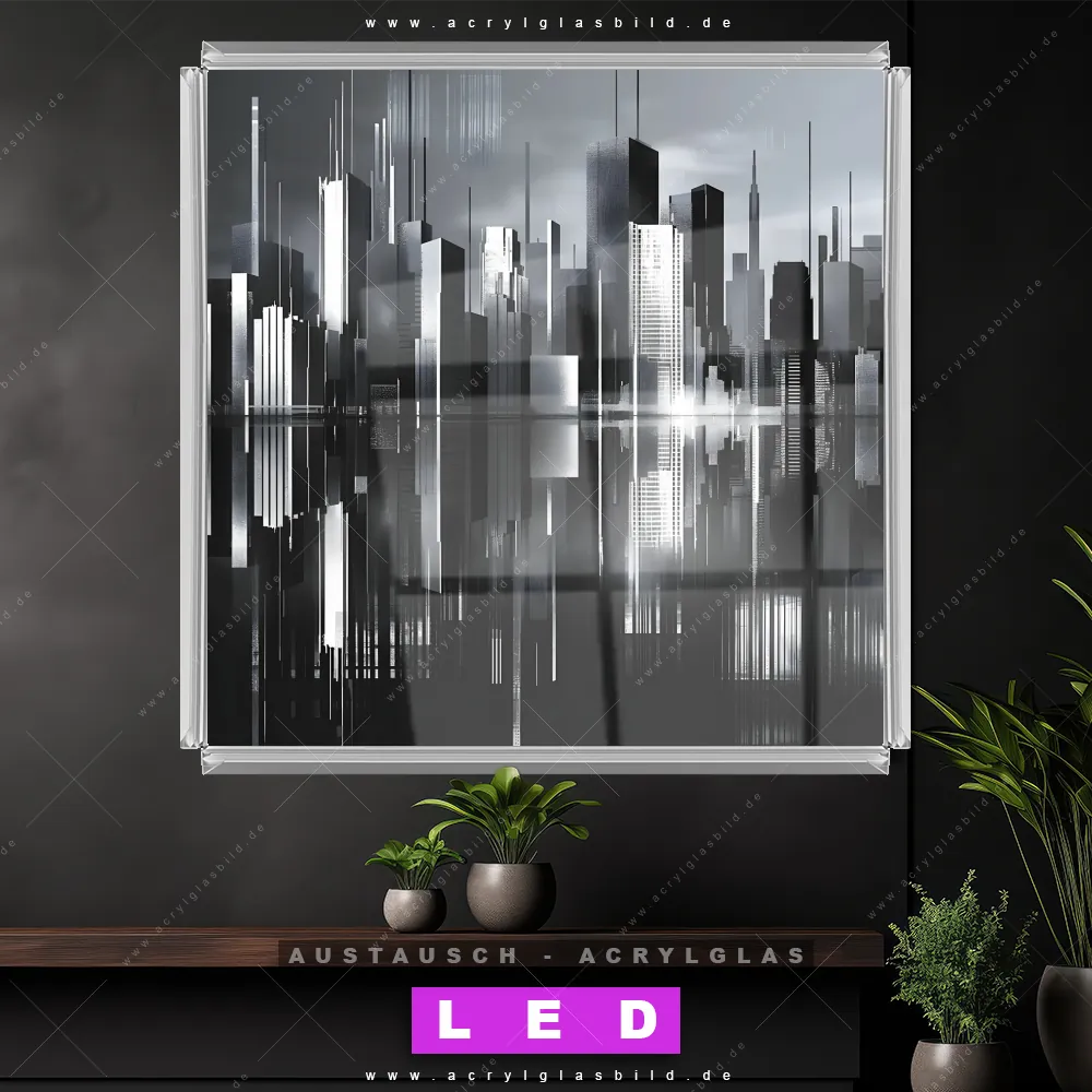 Begriffe wie Skyline, Metropole, Häuser, Wolkenkratzer, Hochhäuser, Stadt, Gebäude, Kunst, Malerei haben dich auf der Suche nach deinem neuen Austausch-Acrylglasbild inspiriert? Dann sollte das Wechsel-Acrylglasbild Metropole in Silber & Schwarz für dein bereits vorhandenes LED Acrylglasbild Canvalight® DIA den Weg zu dir finden.