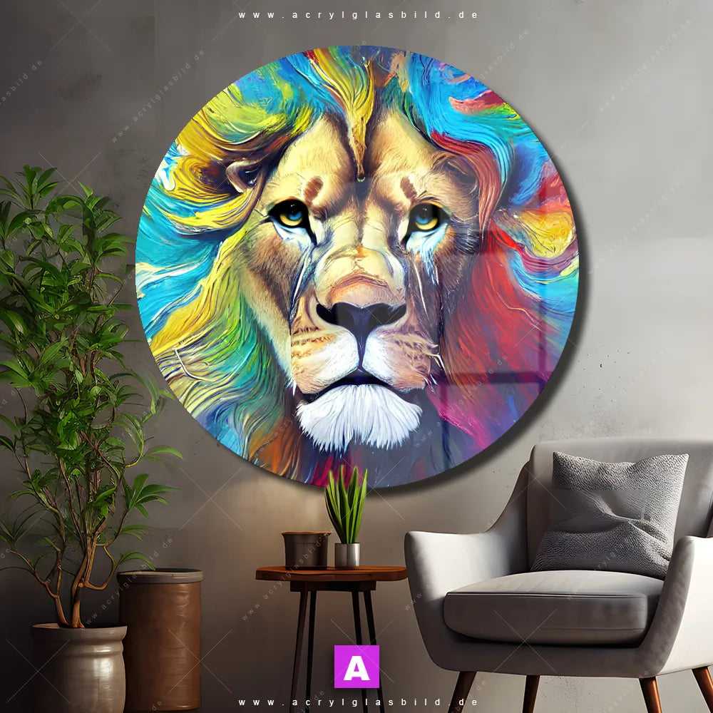 <b>Produktart:</b> Acrylglasbild | Glasbild | Wandbild aus Kunstglas | <b> Motiv:</b> Abstrakter Löwenkopf | <b> Bildausrichtung:</b> Rund | <b> Max. Motiv-Größe:</b> 315cm breit | 210cm hoch | <b> Verfügbare Formate: </b> Quadrat, Querformat, Hochformat, Panorama, Schmal, Rund | <b> Kategorie:</b> Tierwelt | <b> Farben:</b> Bunt, Beige | <b> Kunstformen:</b> Kunst - Malerei | <b> Kunststile:</b> Abstrakt, Modern Art, Pop Art, Street Art