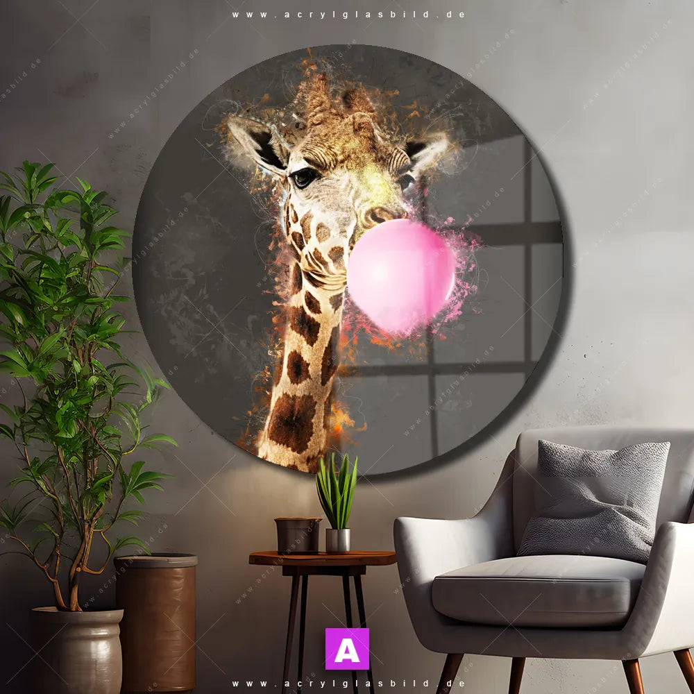 Hey du! Bist du es auch leid, auf langweilige, weiße Wände in deinem Raum zu starren und dich zu fragen, ob das der Sinn des Lebens ist? Unser Acrylglasbild mit dem Titel Bubble Gum Giraffe im Format Rund verwandelt deine Wand in ein Kunstwerk und macht deinen Raum zum absoluten Hingucker.
