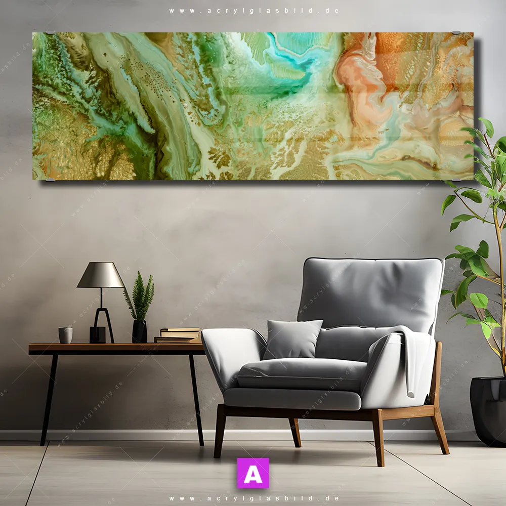 <b>Produktart:</b> Acrylglasbild | Glasbild | Wandbild aus Kunstglas | <b> Motiv:</b> Fluid Art Naturschauspiel | <b> Bildausrichtung:</b> Panorama | <b> Max. Motiv-Größe:</b> 450cm breit | 300cm hoch | <b> Verfügbare Formate: </b> Quadrat, Querformat, Hochformat, Panorama, Schmal, Rund | <b> Kategorie:</b> Muster - Texturen | <b> Farben:</b> Hellgrün, Grün, Beige, Türkis | <b> Kunstformen:</b> Fotografie, Kunst - Malerei | <b> Kunststile:</b> Abstrakt, Modern Art