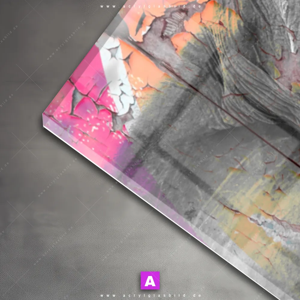 Das Motiv Grunge Elefant wird im UV-Direktdruck in den Farben Pink, Grau , Lila, Weiss, Schwarz auf die Rückseite einer 5mm starken, transparenten Acrylglasplatte gedruckt. Das durchscheinende Motiv Bunte Elemente im Elefantenporträt im Modern Art, Abstrakt, Pop Art Stil wird anschließend vollflächig mit einer weißen Schicht hinterlegt. Das Tierwelt Acrylglasbild | Schmal erhält so eine bemerkenswerte Farbbrillanz, hohe Schärfe und erstaunliche Tiefenwirkung.