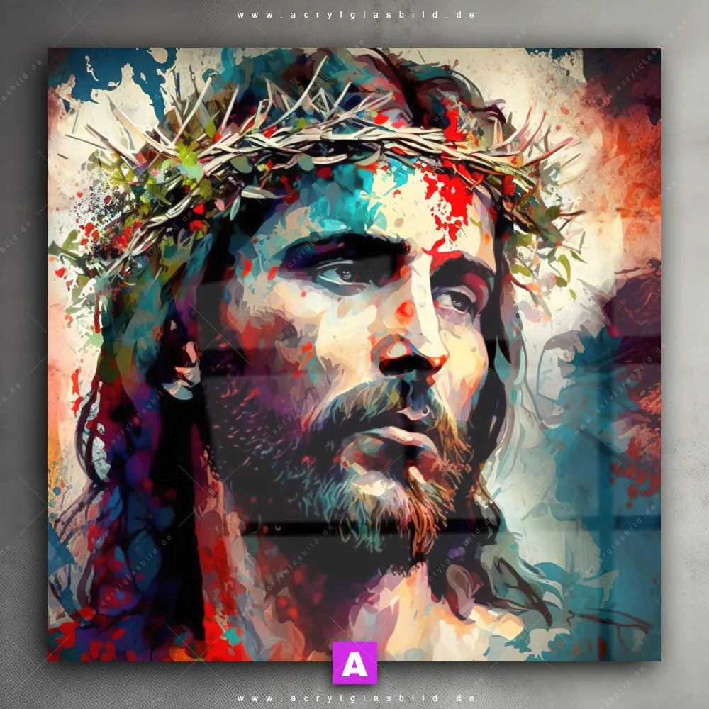 <b>Produktart:</b> Acrylglasbild | Glasbild | Wandbild aus Kunstglas | <b> Motiv:</b> Jesus Christus mit Dornenkrone | <b> Bildausrichtung:</b> Quadrat | <b> Max. Motiv-Größe:</b> 450cm breit | 300cm hoch | <b> Verfügbare Formate: </b> Quadrat, Querformat, Hochformat, Panorama, Schmal, Rund | <b> Kategorie:</b> Porträts - Menschen | <b> Farben:</b> Rot, Blau, Orange, Lila | <b> Kunstformen:</b> Digitale Kunst, KI-generiertes Bild | <b> Kunststile:</b> Abstrakt, Modern Art