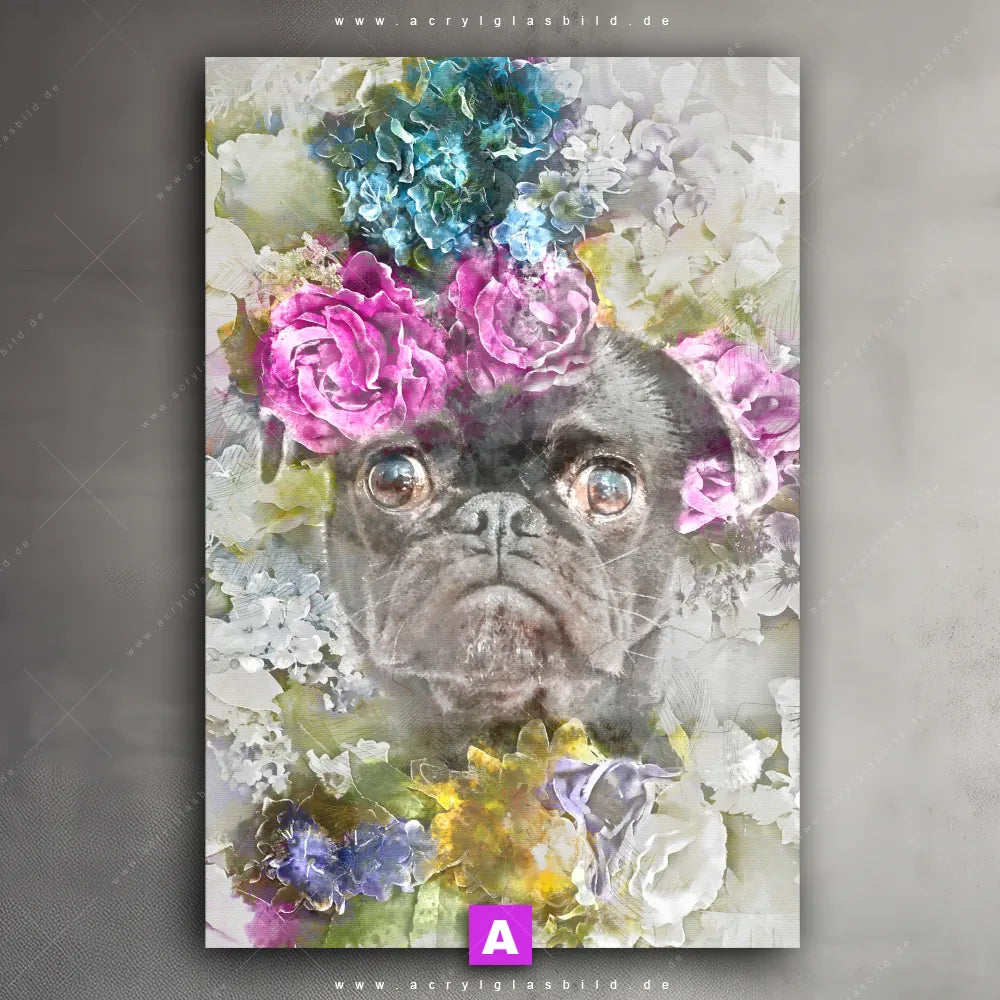 Also, worauf wartest du noch? Verwandle deine schlichten Wände in inspirierende Kunstwerke und bestelle jetzt das Acrylglasbild Porträt eines Mopses mit Blumenkranz!