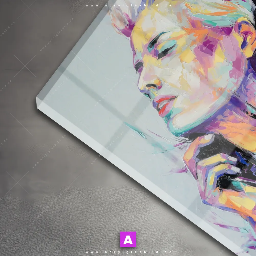 Das Motiv Sinnliche Schönheit wird im UV-Direktdruck in den Farben Türkis, Lila, Hellblau, Weiss auf die Rückseite einer 5mm starken, transparenten Acrylglasplatte gedruckt. Das durchscheinende Motiv buntes Porträt einer Frau im Abstrakt, Modern Art Stil wird anschließend vollflächig mit einer weißen Schicht hinterlegt. Das Porträts - Menschen Acrylglasbild | Quadrat erhält so eine bemerkenswerte Farbbrillanz, hohe Schärfe und erstaunliche Tiefenwirkung.