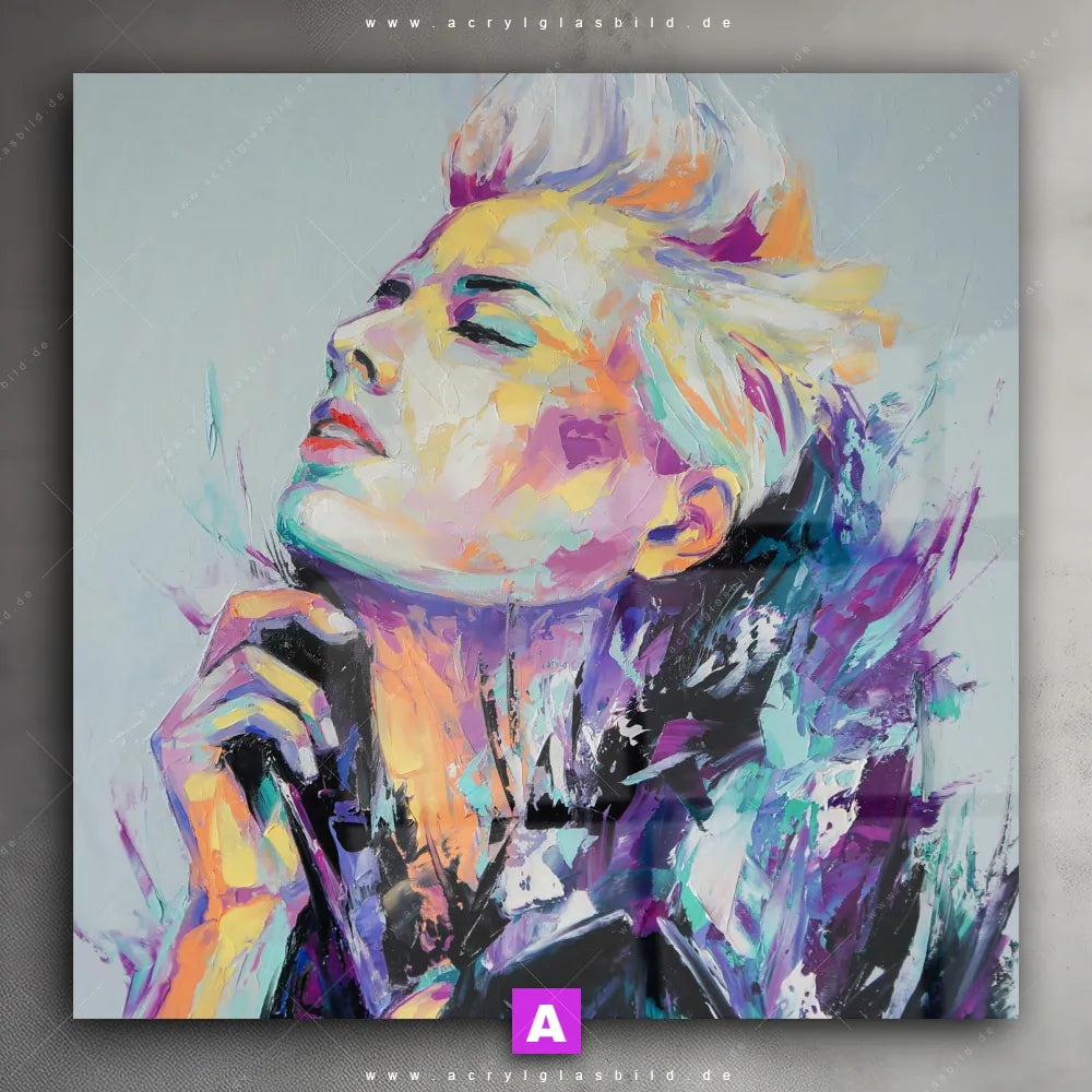 <b>Produktart:</b> Acrylglasbild | Glasbild | Wandbild aus Kunstglas | <b> Motiv:</b> Sinnliche Schönheit | <b> Bildausrichtung:</b> Quadrat | <b> Max. Motiv-Größe:</b> 180cm breit | 250cm hoch | <b> Verfügbare Formate: </b> Quadrat, Querformat, Hochformat, Panorama, Schmal, Rund | <b> Kategorie:</b> Porträts - Menschen | <b> Farben:</b> Türkis, Lila, Hellblau, Weiss | <b> Kunstformen:</b> Kunst - Malerei | <b> Kunststile:</b> Abstrakt, Modern Art