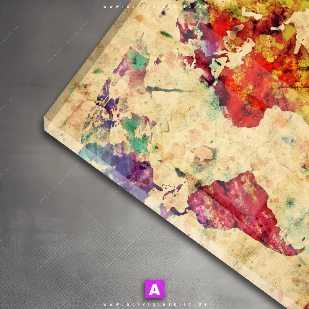 Also, worauf wartest du noch? Verleihe deinen Wänden das gewisse Etwas und bestelle jetzt das Acrylglasbild Karte der Welt in bunt auf altem Papier!