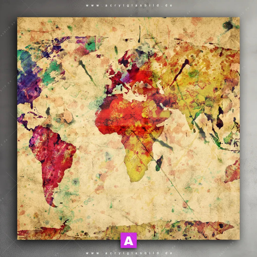 Das Motiv Weltkarte Retro Bunt wird im UV-Direktdruck in den Farben Bunt, Beige auf die Rückseite einer 5mm starken, transparenten Acrylglasplatte gedruckt. Das durchscheinende Motiv bunte Kontinente im Abstrakt, Grunge, Retro - Vintage, Modern Art Stil wird anschließend vollflächig mit einer weißen Schicht hinterlegt. Das Karten Acrylglasbild | Quadrat erhält so eine bemerkenswerte Farbbrillanz, hohe Schärfe und erstaunliche Tiefenwirkung.