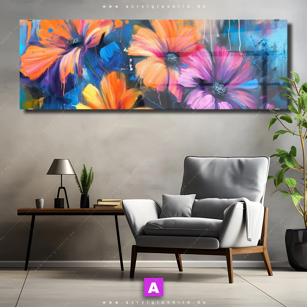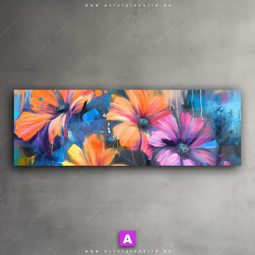 <b>Produktart:</b> Acrylglasbild | Glasbild | Wandbild aus Kunstglas | <b> Motiv:</b> Abstrakte Blumenpracht | <b> Bildausrichtung:</b> Panorama | <b> Max. Motiv-Größe:</b> 450cm breit | 300cm hoch | <b> Verfügbare Formate: </b> Quadrat, Querformat, Hochformat, Panorama, Schmal, Rund | <b> Kategorie:</b>  Blumen - Botanik | <b> Farben:</b>  Blau, Orange, Lila, Pink | <b> Kunstformen:</b>  Digitale Kunst, Kunst - Malerei | <b> Kunststile:</b>  Abstrakt, Floral, Modern Art