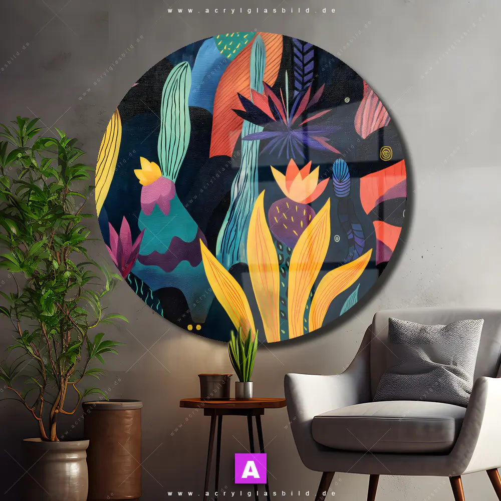 <b>Produktart:</b> Acrylglasbild | Glasbild | Wandbild aus Kunstglas | <b> Motiv:</b> Abstrakte Natur | <b> Bildausrichtung:</b> Rund | <b> Max. Motiv-Größe:</b> 360cm breit | 240cm hoch | <b> Verfügbare Formate: </b> Quadrat, Querformat, Hochformat, Panorama, Schmal, Rund | <b> Kategorie:</b> Blumen - Botanik, Muster - Texturen | <b> Farben:</b> Schwarz, Gelb , Rot, Türkis, Rosa, Pink | <b> Kunstformen:</b> Digitale Kunst, Kunst - Malerei | <b> Kunststile:</b> Abstrakt, Floral, Modern Art