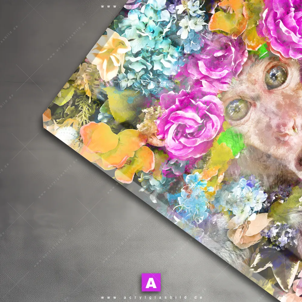 Das Beste daran ist, dass unser Acrylglasbild Verspieltes Äffchen zwischen farbigen Blüten im Stil Floral, Modern Art perfekt zu jedem Einrichtungsstil passt. Gestaltet als Kunst - Malerei, bringt es nicht nur deine Wand, sondern auch dein Herz zum Strahlen.