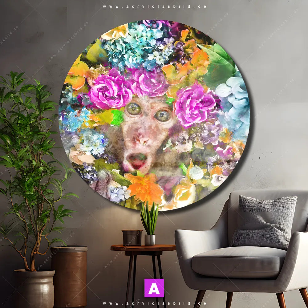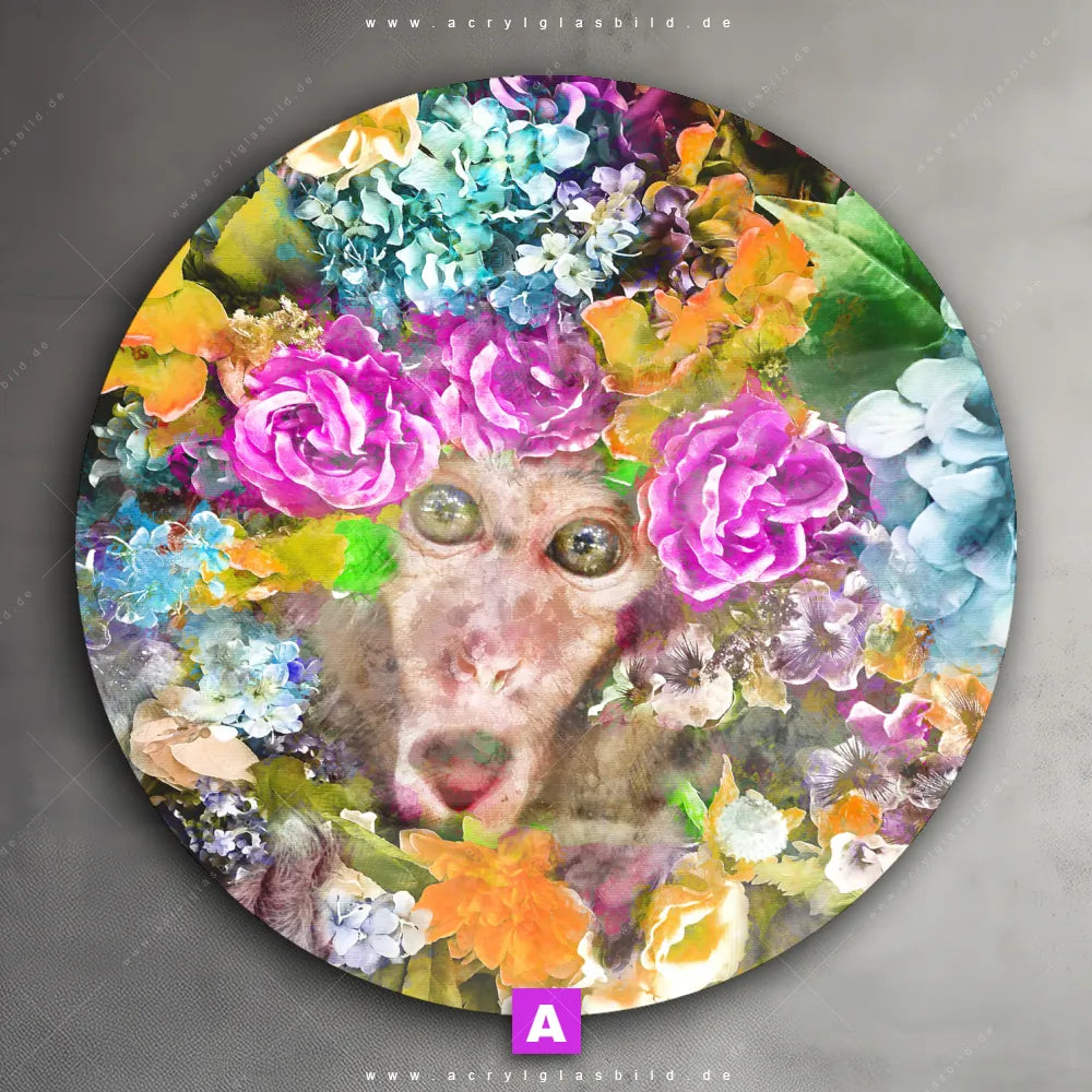 <b>Produktart:</b> Acrylglasbild | Glasbild | Wandbild aus Kunstglas | <b> Motiv:</b> Äffchen & Blumen | <b> Bildausrichtung:</b> Rund | <b> Max. Motiv-Größe:</b> 270cm breit | 180cm hoch | <b> Verfügbare Formate: </b> Quadrat, Querformat, Hochformat, Panorama, Schmal, Rund | <b> Kategorie:</b> Tierwelt, Blumen - Botanik | <b> Farben:</b> Bunt | <b> Kunstformen:</b> Kunst - Malerei | <b> Kunststile:</b> Floral, Modern Art
