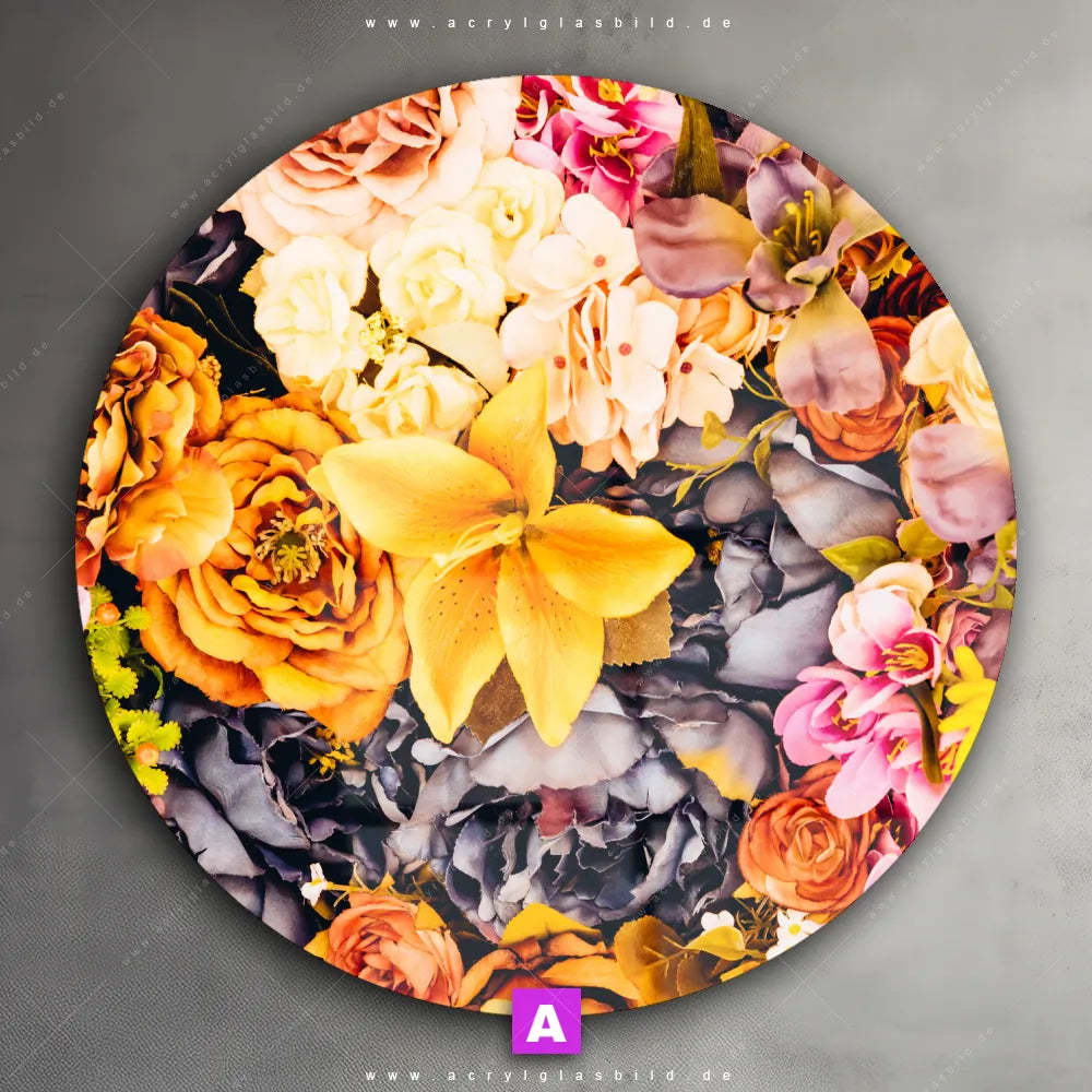 Das Motiv Blütenzauber wird im UV-Direktdruck in den Farben Pink, Rosa, Orange, Bunt, Hellgrün, Gelb , Beige, Weiss auf die Rückseite einer 5mm starken, transparenten Acrylglasplatte gedruckt. Das durchscheinende Motiv Duftender Blumengruß im Floral, Retro - Vintage Stil wird anschließend vollflächig mit einer weißen Schicht hinterlegt. Das Blumen - Botanik Acrylglasbild | Rund erhält so eine bemerkenswerte Farbbrillanz, hohe Schärfe und erstaunliche Tiefenwirkung.