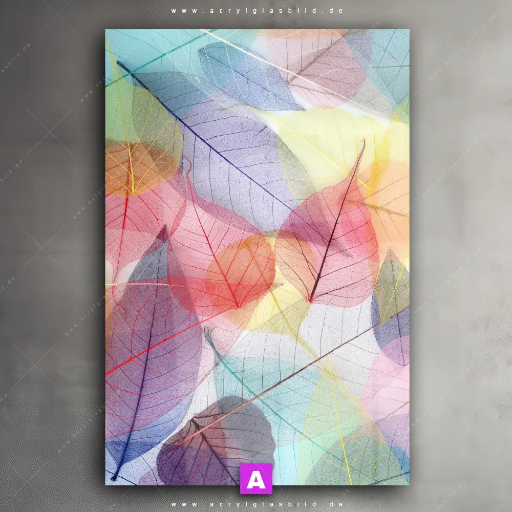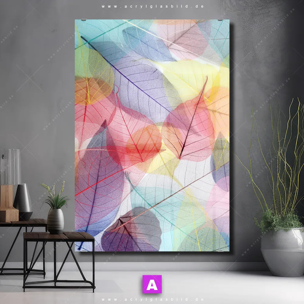 <b>Produktart:</b> Acrylglasbild | Glasbild | Wandbild aus Kunstglas | <b> Motiv:</b> Bunte Blätter | <b> Bildausrichtung:</b> Hochformat | <b> Max. Motiv-Größe:</b> 300cm breit | 450cm hoch | <b> Verfügbare Formate: </b> Quadrat, Querformat, Hochformat, Panorama, Schmal, Rund | <b> Kategorie:</b> Muster - Texturen, Blumen - Botanik | <b> Farben:</b> Bunt, Blau, Gelb , Grün, Rot, Orange, Rosa, Lila, Hellblau, Türkis | <b> Kunstformen:</b> Fotografie, Digitale Kunst | <b> Kunststile:</b> Floral, Modern Art