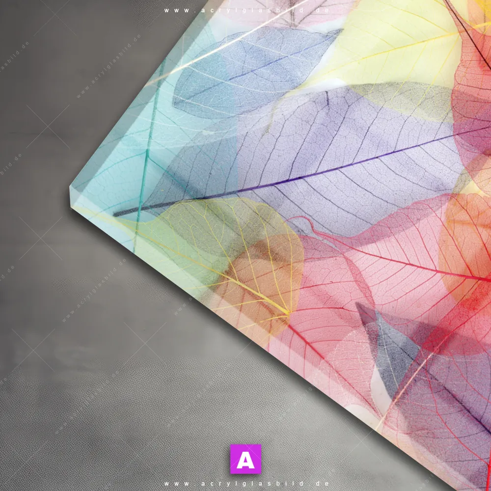 Das Motiv Bunte Blätter wird im UV-Direktdruck in den Farben Bunt, Blau, Gelb , Grün, Rot, Orange, Rosa, Lila, Hellblau, Türkis auf die Rückseite einer 5mm starken, transparenten Acrylglasplatte gedruckt. Das durchscheinende Motiv zarte Blattstrukturen im Floral, Modern Art Stil wird anschließend vollflächig mit einer weißen Schicht hinterlegt. Das Muster - Texturen, Blumen - Botanik Acrylglasbild | Hochformat erhält so eine bemerkenswerte Farbbrillanz, hohe Schärfe und erstaunliche Tiefenwirkung.