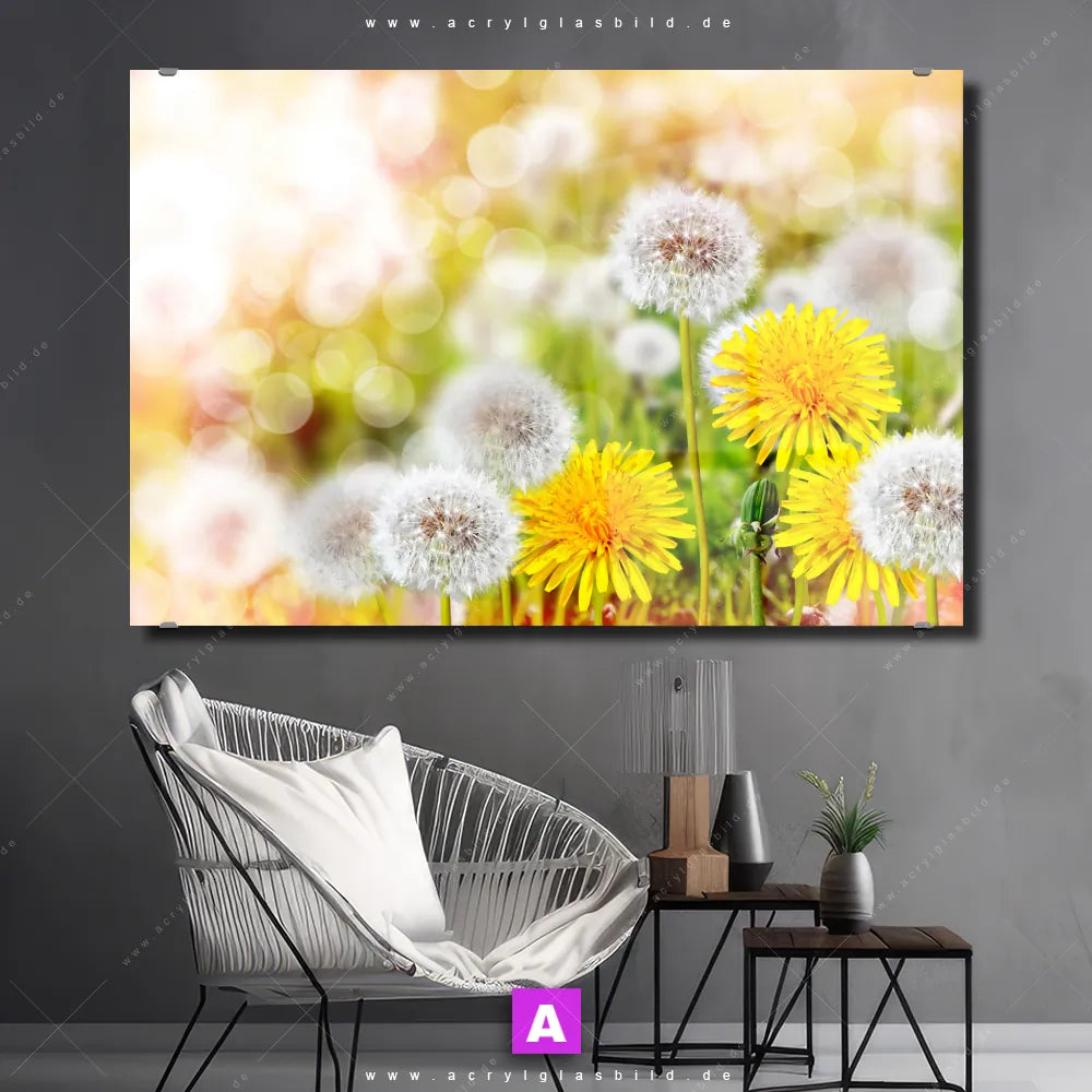 Hallo, du Meister der Dekoration oder Königin des Stils, bist du bereit, deine Räume, wie Arzt - Praxis, Wohnzimmer - Schlafzimmer, Flur - Eingangsbereich, in einen kreativen Kunstsalon zu verwandeln? Dann haben wir das perfekte Wandkunstwerk für dich: Unser Acrylglasbild Gelber Löwenzahn im Querformat wird im Handumdrehen jeden Raum auf ein neues Level heben!