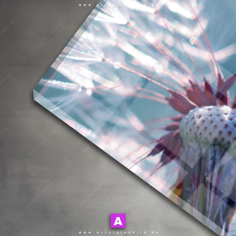 Das Motiv Pusteblume & Marienkäfer wird im UV-Direktdruck in den Farben Türkis, Blau, Rot, Hellgrün auf die Rückseite einer 5mm starken, transparenten Acrylglasplatte gedruckt. Das durchscheinende Motiv Dandelion mit rotem Käfer im Floral, Modern Art Stil wird anschließend vollflächig mit einer weißen Schicht hinterlegt. Das Blumen - Botanik, Tierwelt Acrylglasbild | Panorama erhält so eine bemerkenswerte Farbbrillanz, hohe Schärfe und erstaunliche Tiefenwirkung.