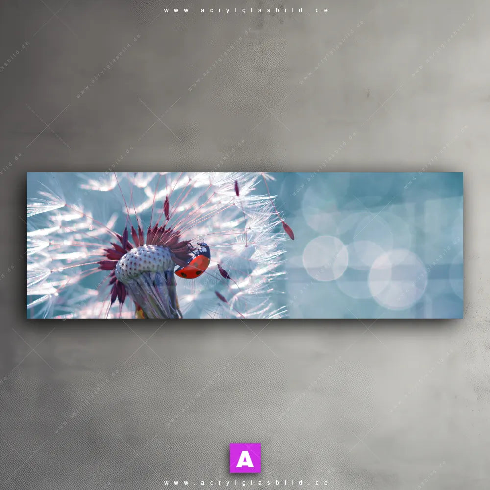 <b>Produktart:</b> Acrylglasbild | Glasbild | Wandbild aus Kunstglas | <b> Motiv:</b> Pusteblume & Marienkäfer | <b> Bildausrichtung:</b> Panorama | <b> Max. Motiv-Größe:</b> 450cm breit | 300cm hoch | <b> Verfügbare Formate: </b> Quadrat, Querformat, Hochformat, Panorama, Schmal, Rund | <b> Kategorie:</b> Blumen - Botanik, Tierwelt | <b> Farben:</b> Türkis, Blau, Rot, Hellgrün | <b> Kunstformen:</b> Fotografie, Digitale Kunst | <b> Kunststile:</b> Floral, Modern Art