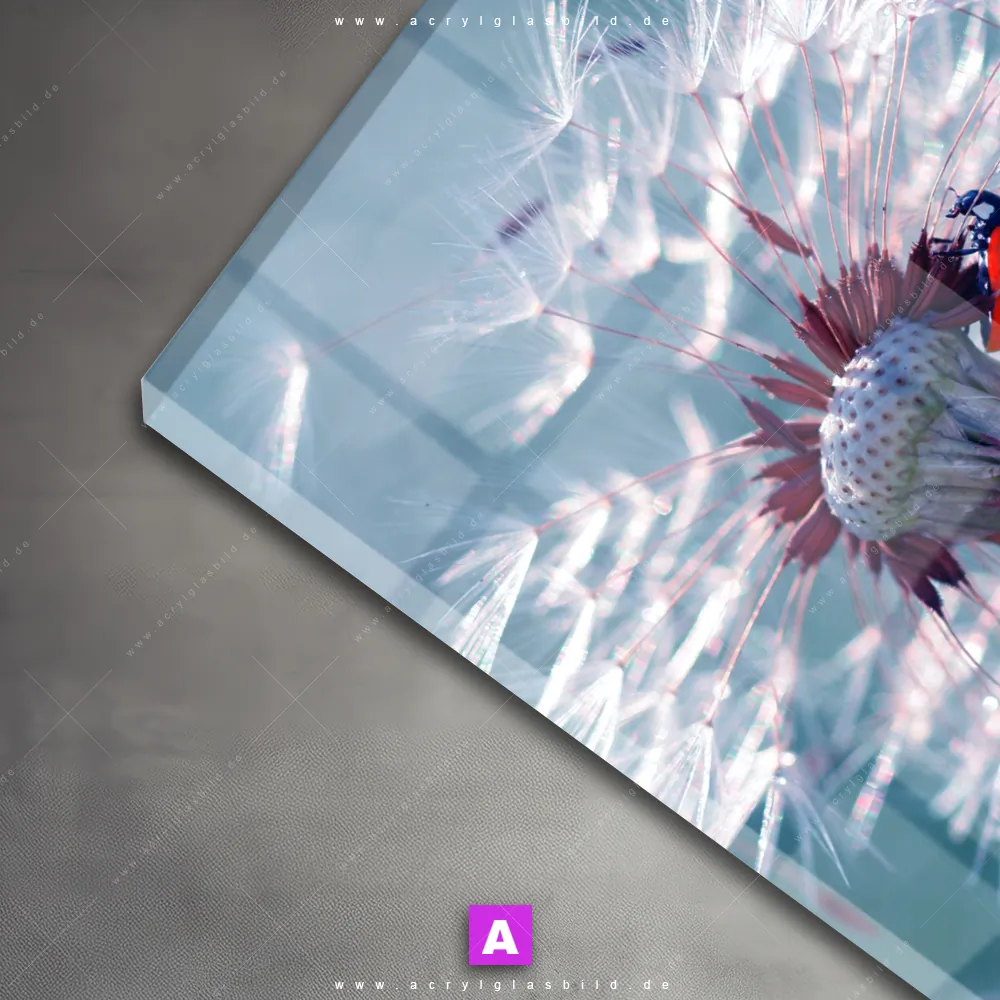 Das Motiv Pusteblume & Marienkäfer wird im UV-Direktdruck in den Farben Türkis, Blau, Rot, Hellgrün auf die Rückseite einer 5mm starken, transparenten Acrylglasplatte gedruckt. Das durchscheinende Motiv Dandelion mit rotem Käfer im Floral, Modern Art Stil wird anschließend vollflächig mit einer weißen Schicht hinterlegt. Das Blumen - Botanik, Tierwelt Acrylglasbild | Quadrat erhält so eine bemerkenswerte Farbbrillanz, hohe Schärfe und erstaunliche Tiefenwirkung.