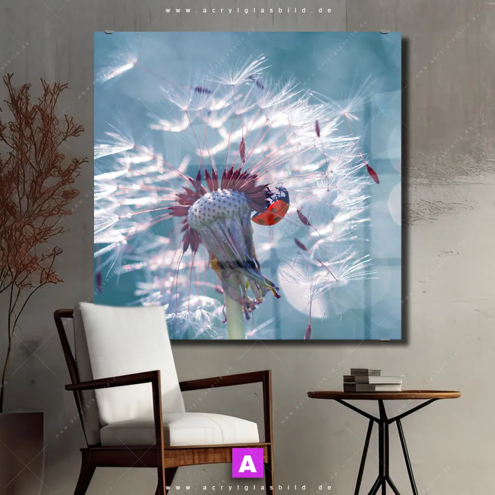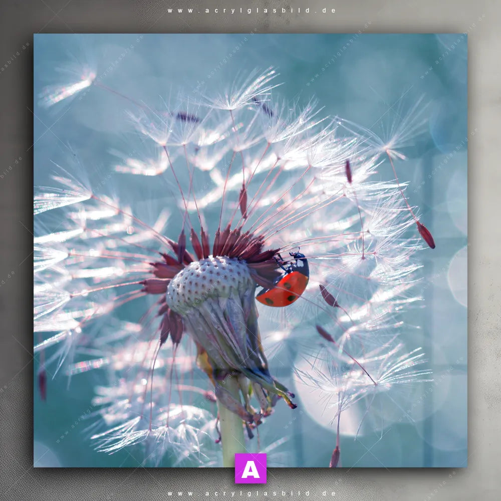 <b>Produktart:</b> Acrylglasbild | Glasbild | Wandbild aus Kunstglas | <b> Motiv:</b> Pusteblume & Marienkäfer | <b> Bildausrichtung:</b> Quadrat | <b> Max. Motiv-Größe:</b> 450cm breit | 300cm hoch | <b> Verfügbare Formate: </b> Quadrat, Querformat, Hochformat, Panorama, Schmal, Rund | <b> Kategorie:</b> Blumen - Botanik, Tierwelt | <b> Farben:</b> Türkis, Blau, Rot, Hellgrün | <b> Kunstformen:</b> Fotografie, Digitale Kunst | <b> Kunststile:</b> Floral, Modern Art