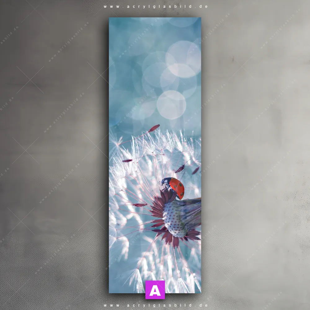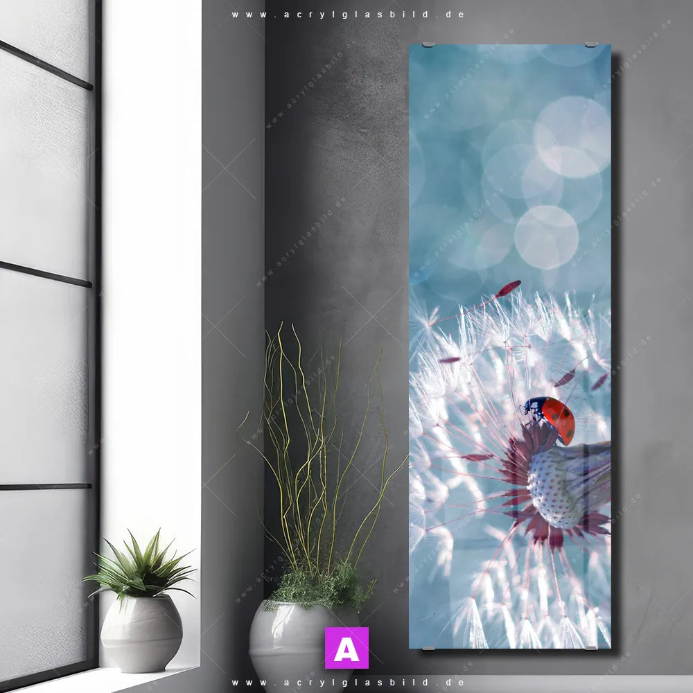 <b>Produktart:</b> Acrylglasbild | Glasbild | Wandbild aus Kunstglas | <b> Motiv:</b> Pusteblume & Marienkäfer | <b> Bildausrichtung:</b> Schmal | <b> Max. Motiv-Größe:</b> 450cm breit | 300cm hoch | <b> Verfügbare Formate: </b> Quadrat, Querformat, Hochformat, Panorama, Schmal, Rund | <b> Kategorie:</b> Blumen - Botanik, Tierwelt | <b> Farben:</b> Türkis, Blau, Rot, Hellgrün | <b> Kunstformen:</b> Fotografie, Digitale Kunst | <b> Kunststile:</b> Floral, Modern Art