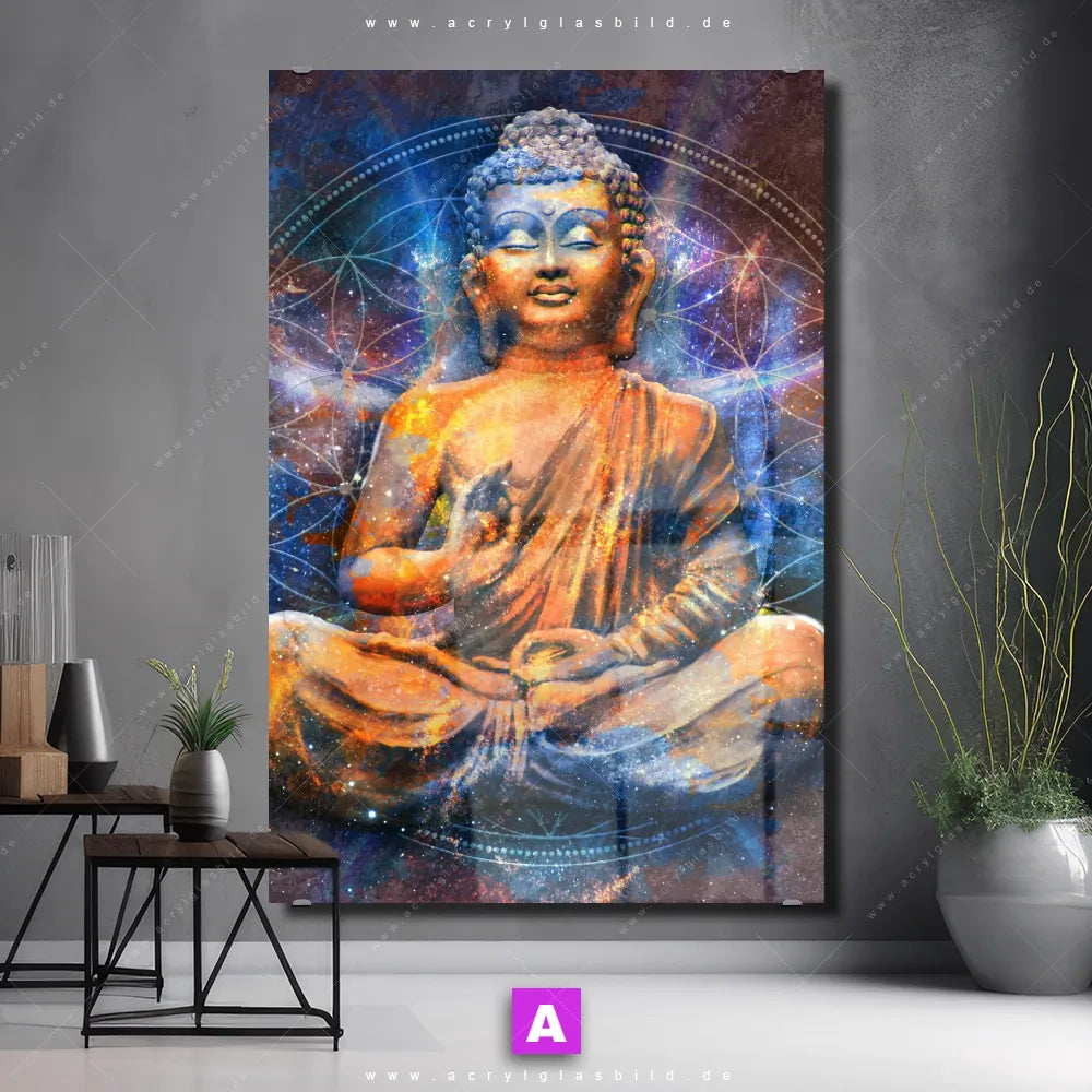 <b>Produktart:</b> Acrylglasbild | Glasbild | Wandbild aus Kunstglas | <b> Motiv:</b> Buddha in Meditation | <b> Bildausrichtung:</b> Hochformat | <b> Max. Motiv-Größe:</b> 240cm breit | 240cm hoch | <b> Verfügbare Formate: </b> Quadrat, Querformat, Hochformat, Panorama, Schmal, Rund | <b> Kategorie:</b> Buddha - Feng Shui | <b> Farben:</b> Blau, Gold, Gelb , Braun, Hellblau, Orange | <b> Kunstformen:</b> Digitale Kunst | <b> Kunststile:</b> Grunge, Modern Art, Mixed Media