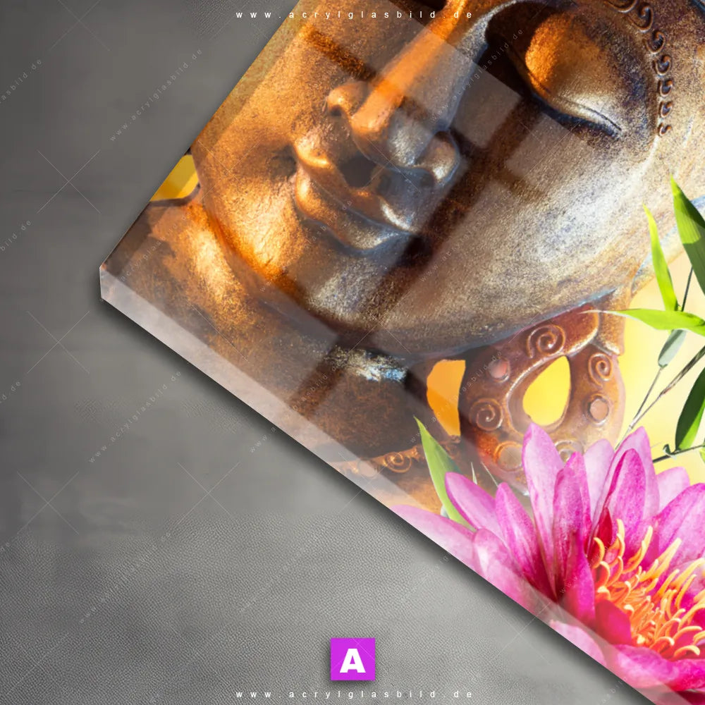 Unser Acrylglasbild Buddha mit Blüte aus der Kategorie Buddha - Feng Shui wird deinem Raum einen Hauch von Luxus verleihen, und du wirst nie wieder von Langeweile geplagt sein. Und wenn du nach einem Bild mit Buddhismus, Religion, Zen, Meditation, Seerose, Blume, Bambus, Buddha suchst, empfehlen wir dir unser Acrylglasbild Kopf des Erwachers in den aufregenden Farben Pink, Braun, Beige. Mit seiner Gestaltung als Fotografie passt es hervorragend zum Modern Art-Stil.