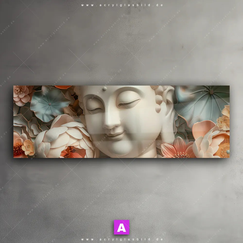 <b>Produktart:</b> Acrylglasbild | Glasbild | Wandbild aus Kunstglas | <b> Motiv:</b> Buddha-Statue mit Blüten | <b> Bildausrichtung:</b> Panorama | <b> Max. Motiv-Größe:</b> 300cm breit | 300cm hoch | <b> Verfügbare Formate: </b> Quadrat, Querformat, Hochformat, Panorama, Schmal, Rund | <b> Kategorie:</b> Buddha - Feng Shui, Blumen - Botanik | <b> Farben:</b> Beige, Orange, Blau | <b> Kunstformen:</b> Digitale Kunst | <b> Kunststile:</b> Floral, Modern Art
