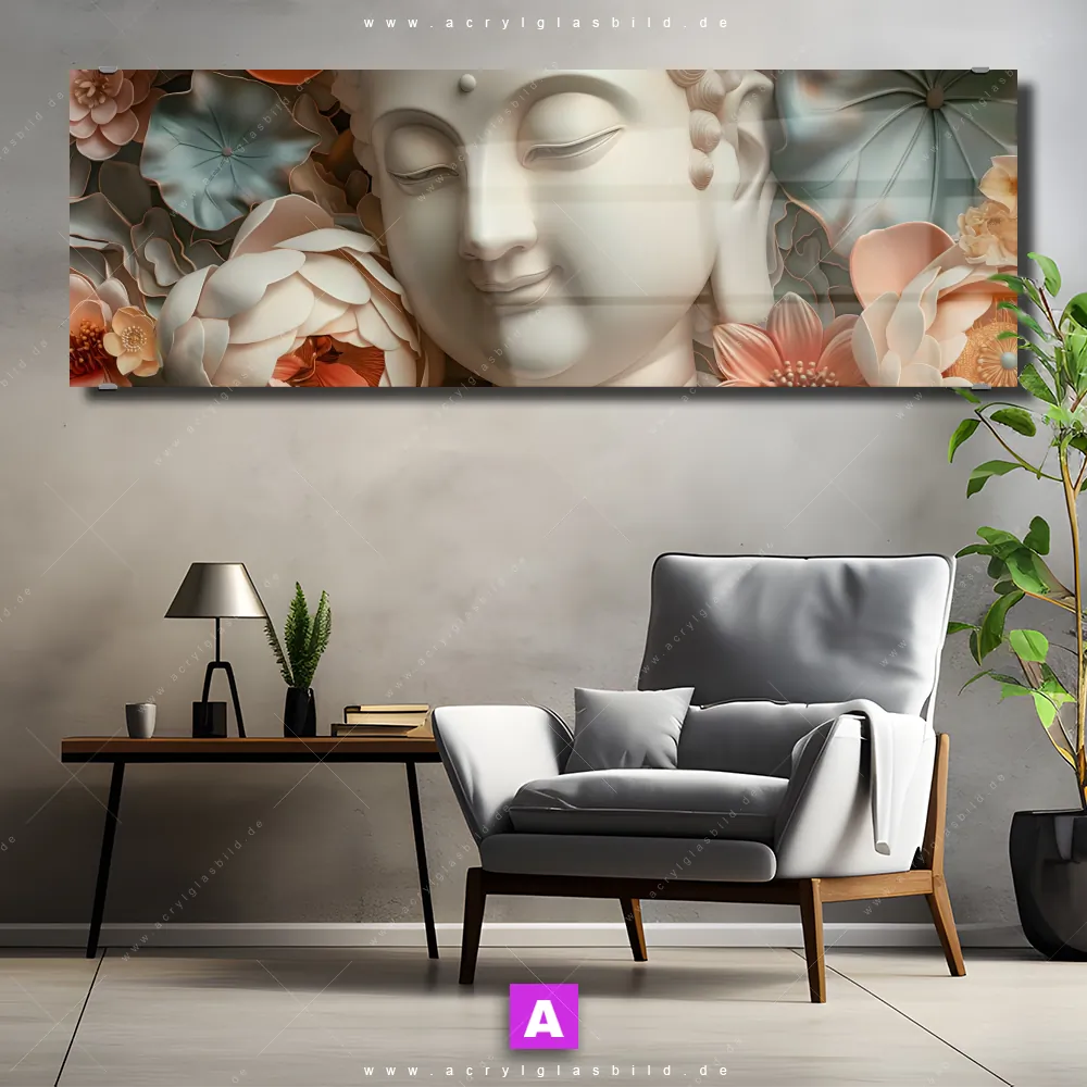 Fehlt dir die Inspiration beim Anblick deiner Wände, sodass selbst das Zählen der Wandfarbtropfen aufregender erscheint? Keine Sorge, wir haben das perfekte Kunstwerk für dich! Mit unserem Acrylglasbild Buddha-Statue mit Blüten im Panorama-Format verleihst du deinem Raum den dringend benötigten Wow-Faktor. Lass deine Wände mit unserem Buddha-Kunst mit Blumen Acrylglasbild zum Star werden!