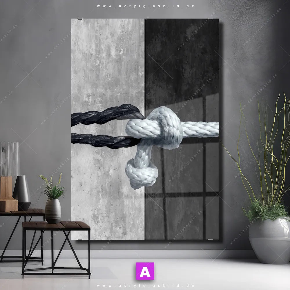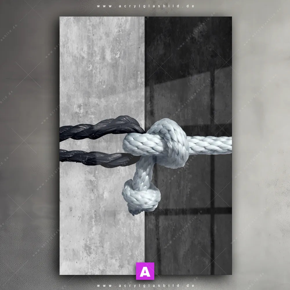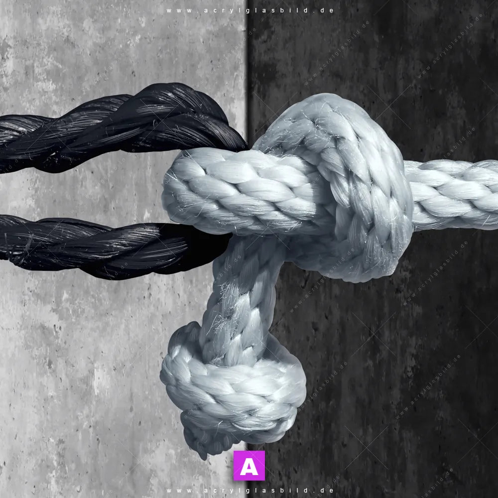 Wenn du auf der Suche nach einem Wandkunstwerk bist, das deine Sinne anregt und deine kreative Seite erweckt, dann ist unser Acrylglasbild symbolisch verknotete Seile aus der Kategorie Porträts - Menschen, Buddha - Feng Shui die perfekte Wahl für dich. Entscheide dich für das Acrylglasbild Symbolbild mit Seilen in den faszinierenden Farben Weiss, Schwarz, da es ideal zu deinem Einrichtungsstil im Natürlich - Realistisch, Schwarz - Weiss-Look passt.