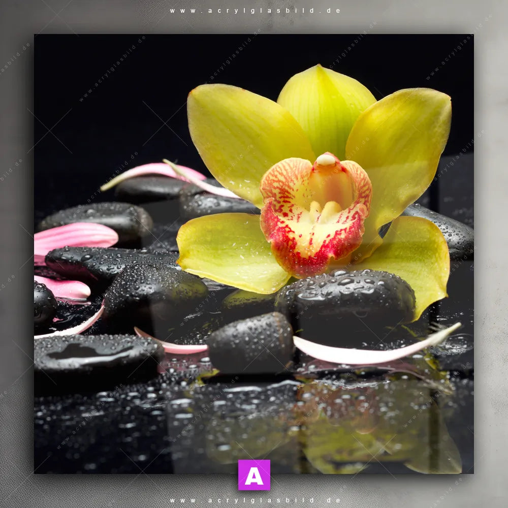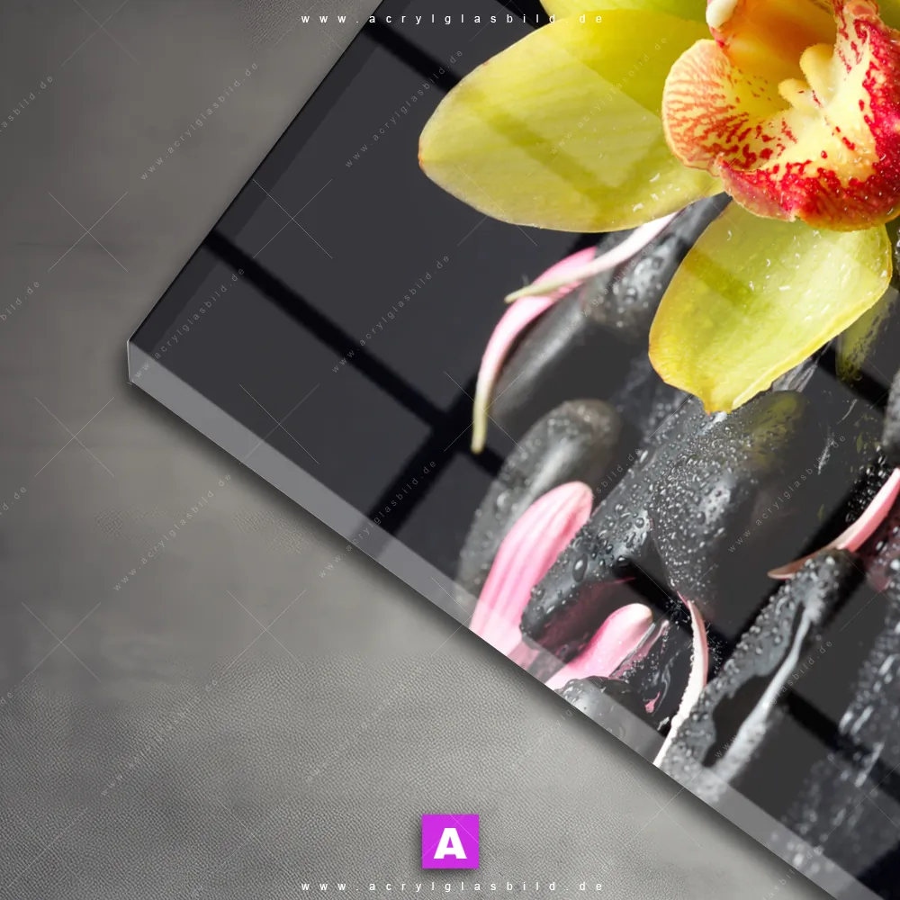 Das Motiv Gelbe Orchidee wird im UV-Direktdruck in den Farben Schwarz, Grün, Orange, Rosa auf die Rückseite einer 5mm starken, transparenten Acrylglasplatte gedruckt. Das durchscheinende Motiv Steine mit Wassertropfen und gelber Blüte im Floral, Modern Art Stil wird anschließend vollflächig mit einer weißen Schicht hinterlegt. Das Buddha - Feng Shui, Blumen - Botanik Acrylglasbild | Quadrat erhält so eine bemerkenswerte Farbbrillanz, hohe Schärfe und erstaunliche Tiefenwirkung.