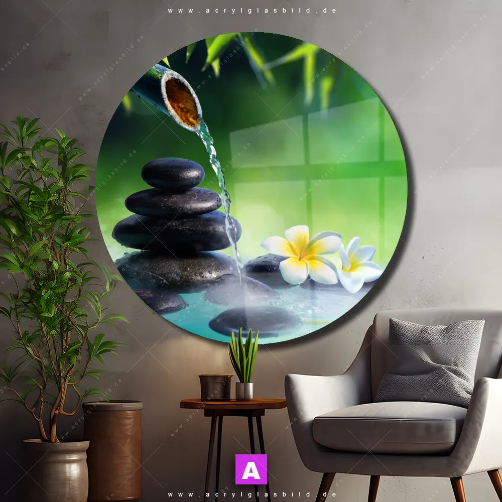 Das Motiv Japanischer Brunnen wird im UV-Direktdruck in den Farben Grün, Hellgrün, Türkis, Schwarz, Weiss auf die Rückseite einer 5mm starken, transparenten Acrylglasplatte gedruckt. Das durchscheinende Motiv Zen-Steine im Wasser im Mixed Media, Modern Art, Floral Stil wird anschließend vollflächig mit einer weißen Schicht hinterlegt. Das Buddha - Feng Shui, Blumen - Botanik Acrylglasbild | Rund erhält so eine bemerkenswerte Farbbrillanz, hohe Schärfe und erstaunliche Tiefenwirkung.